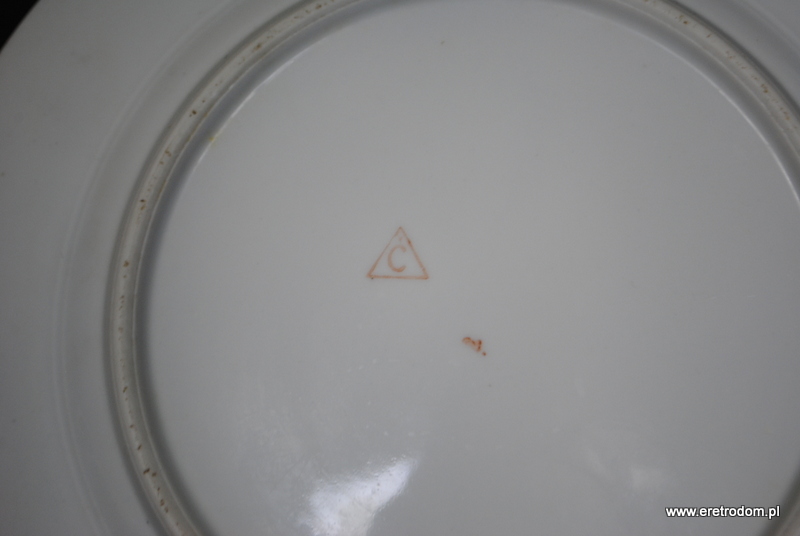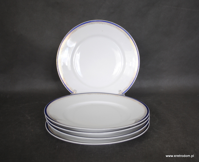 Talerze obiadowe (5 sztuk) sygnowane Ćmielów (I poł. XXw.). Biała porcelana przy rancie ozdobiona granatowym paskiem oraz złotym szlaczkiem.