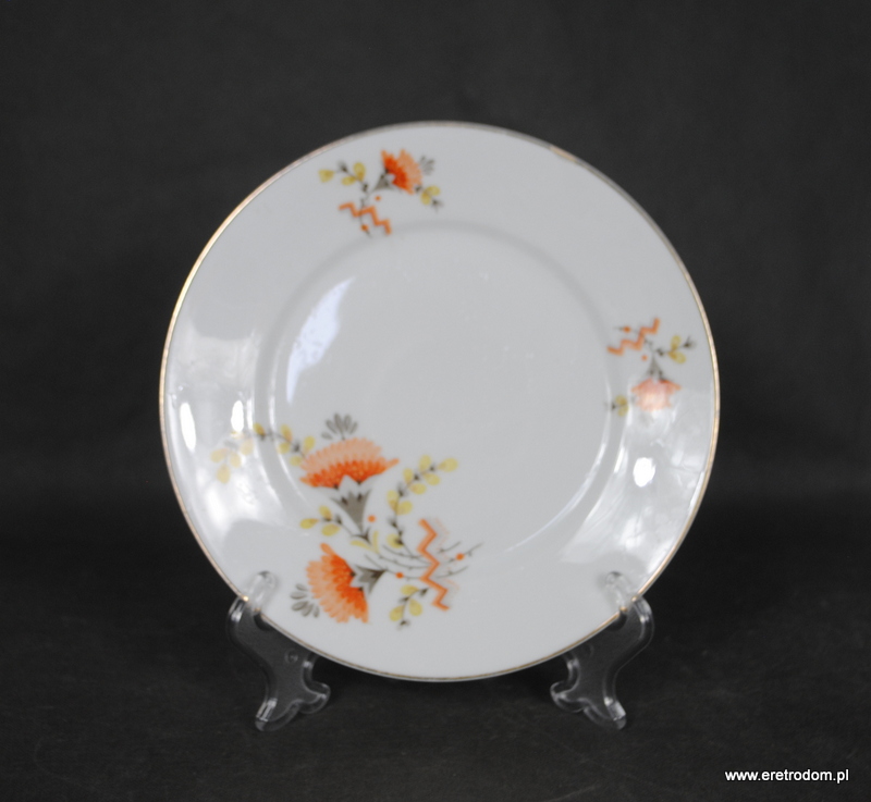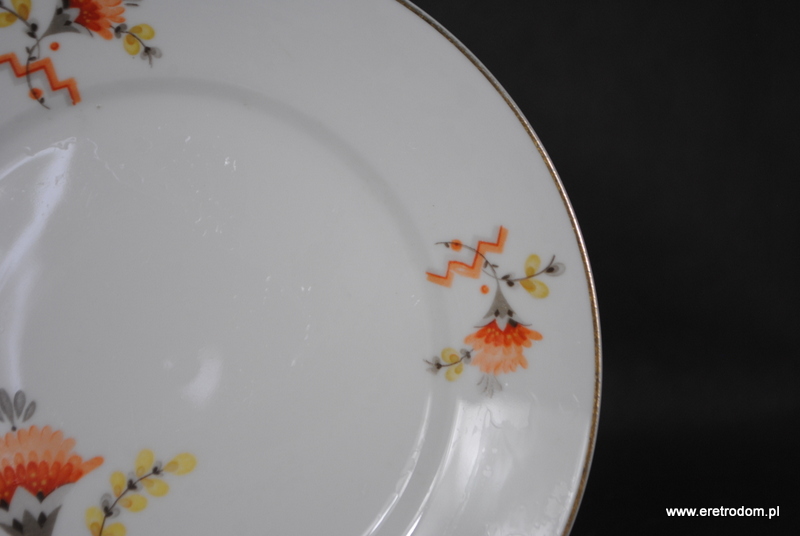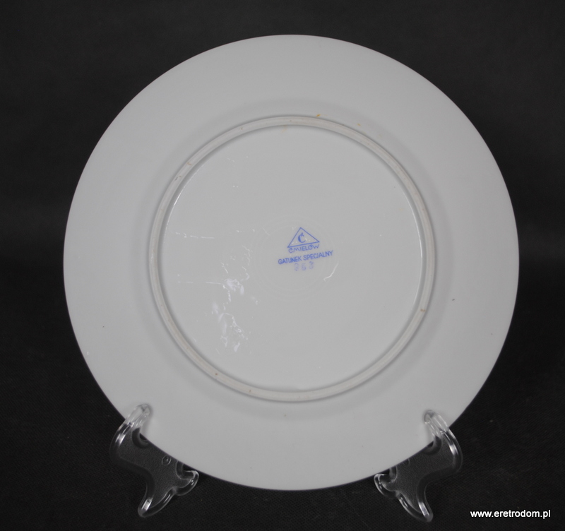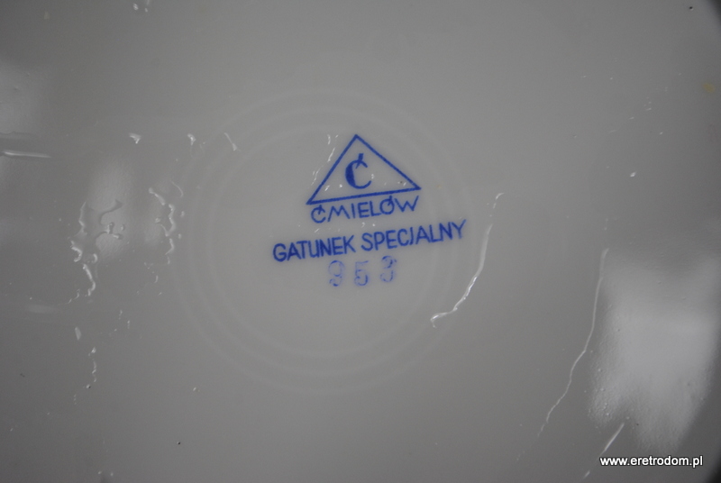 Talerzyk deserowy sygnowany Ćmielów (I poł. XXw). Biała, delikatna porcelana ozdobiona kalką (zdobienie 953).