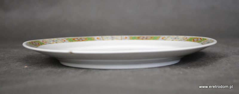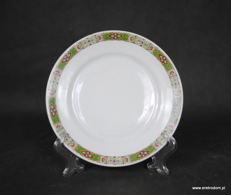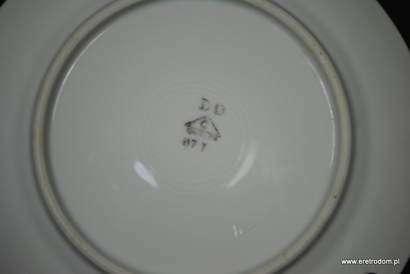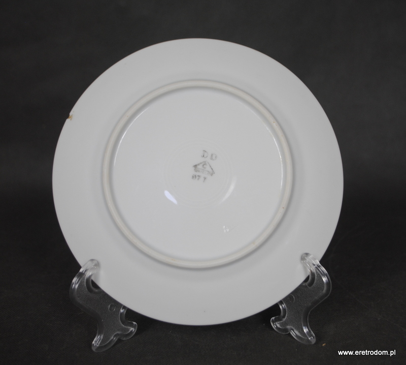 Talerzyk deserowy sygnowany Ćmielów I poł. XXw.. Biała porcelana przy rancie ozdobiona zielonym szlaczkiem. Rant złocony. Od spodu sygnatura producenta.