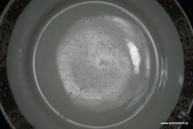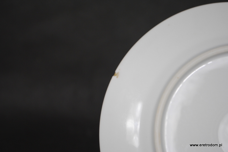 Stan dobry. Posiada niewielkie odprysk na rancie oraz drobne przebarwienia i ryski powstałe z biegiem lat. Przetarcia złocenia.