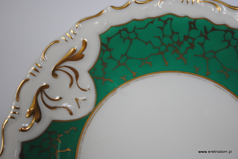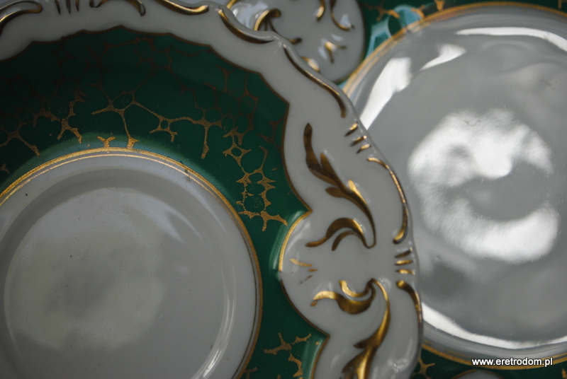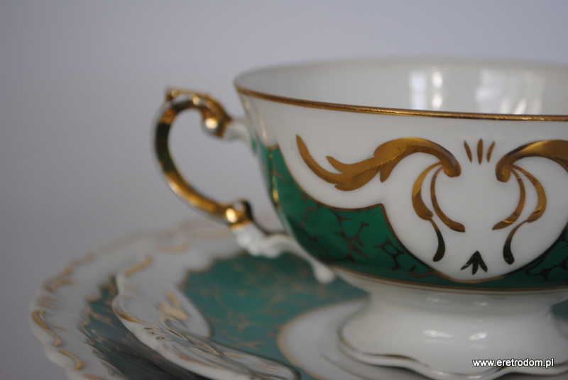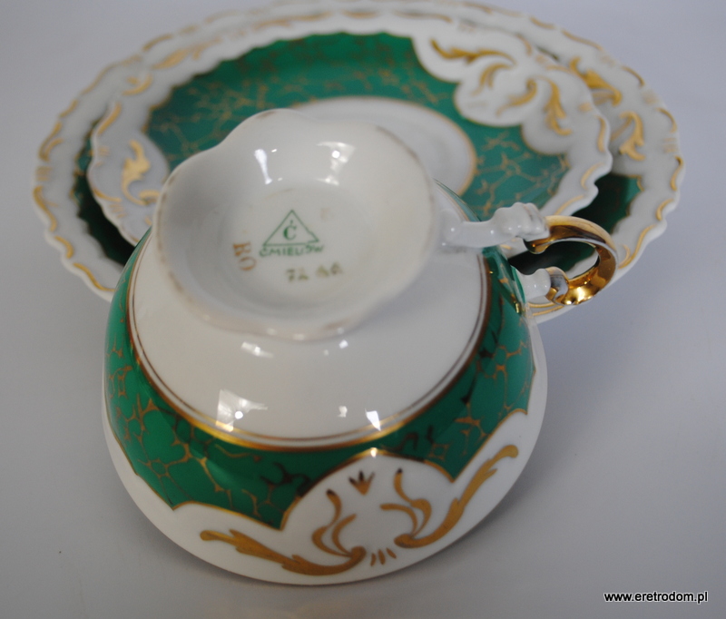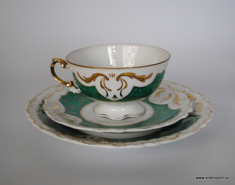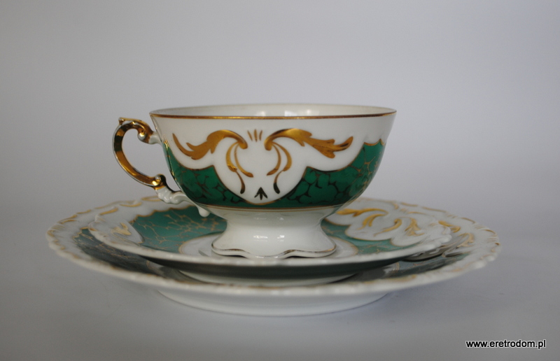 Trio Ćmielów, fason 560, I poł. XXw. Biała porcelana malowana na morski kolor, złocona. Filiżanka, spodek oraz talerzyk deserowy.