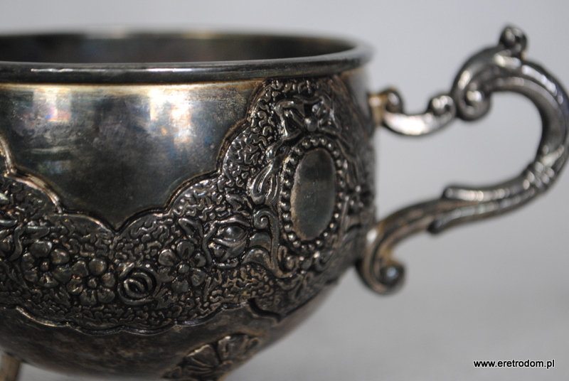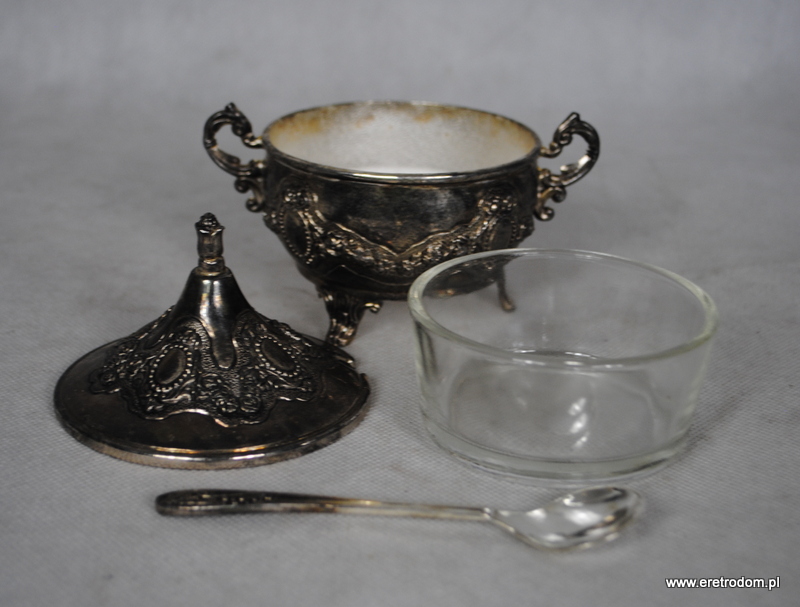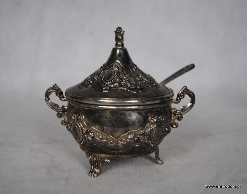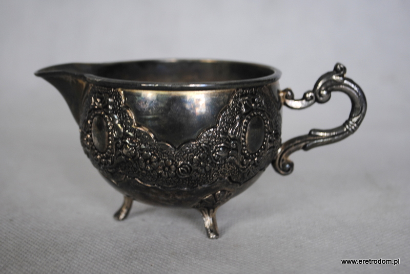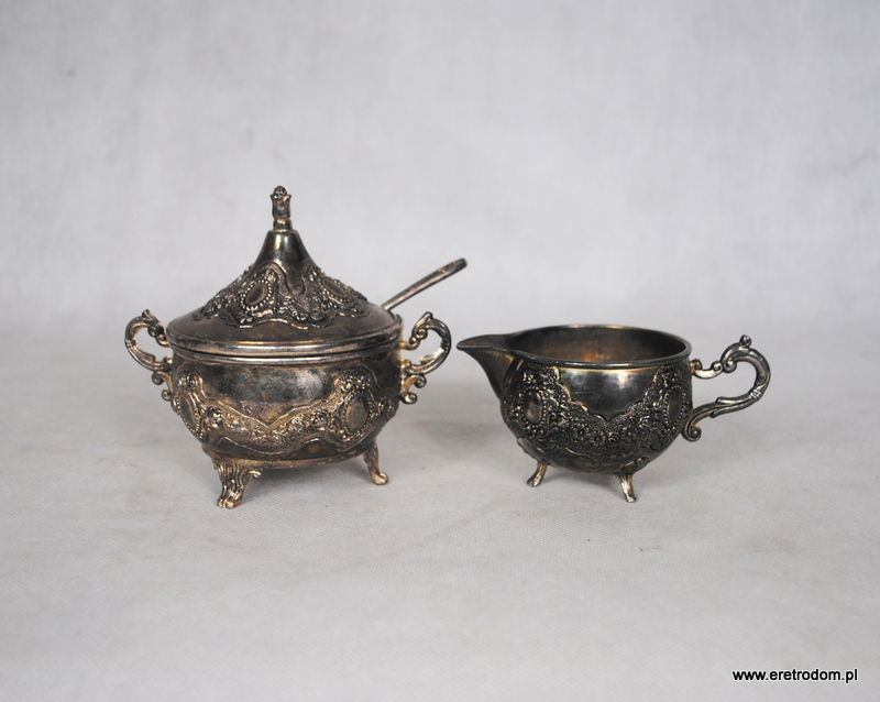 Cukierniczka oraz mlecznik wykonane z metalu platerowanego. Strojna forma bogato zdobiona. Cukierniczka wraz ze szklanym wkładem oraz łyżeczką.