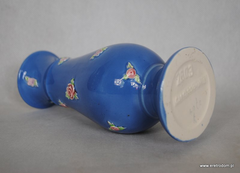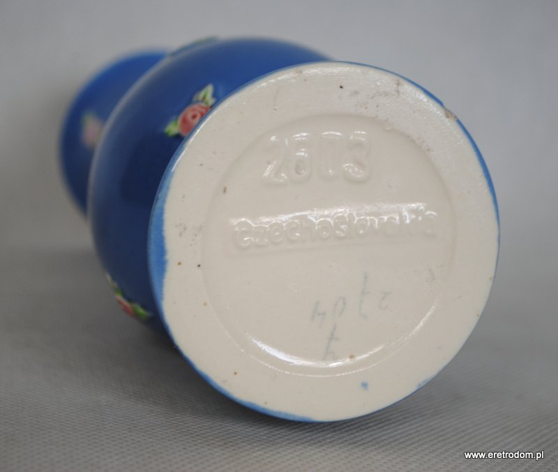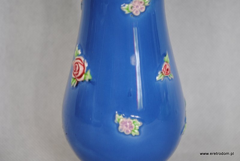 Uroczy wazon, produkcja Czechosłowacja. Ceramika bardzo ładnie malowana na delikatny niebieski kolor, całość ozdobiona plastycznymi kwiatuszkami. Wnętrze wazonu w kolorze żółtym.
