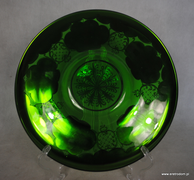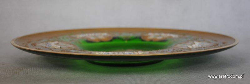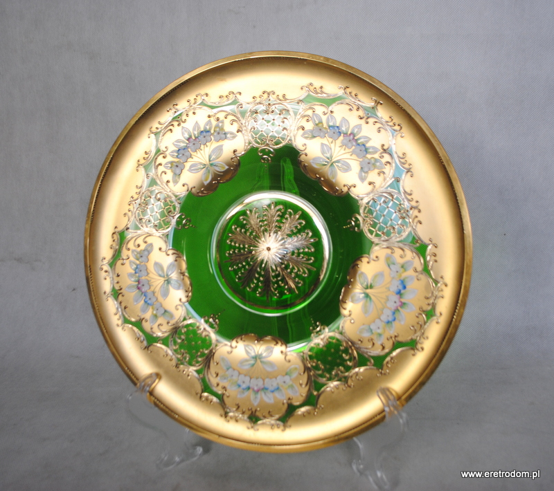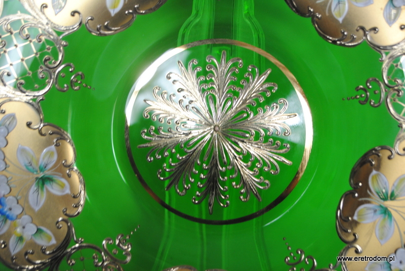 Patera, Bohemia-Czechy. Zielone szkło ręcznie malowane w kwiatuszki, złocone.