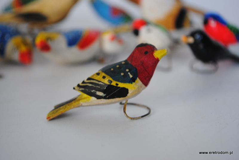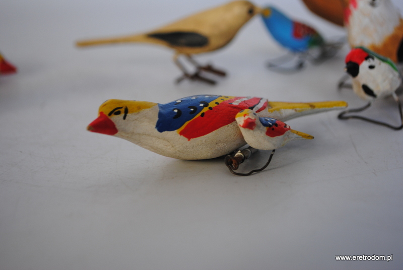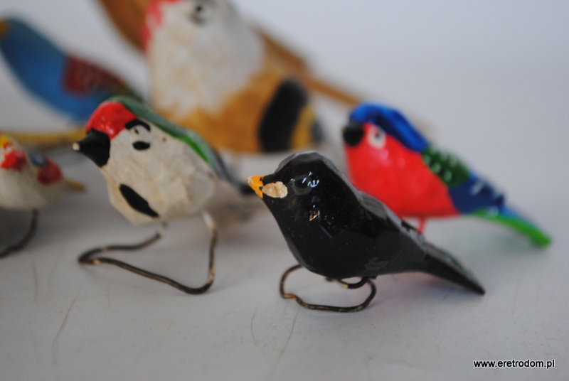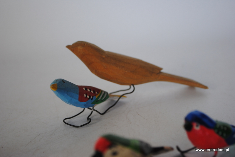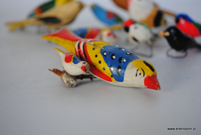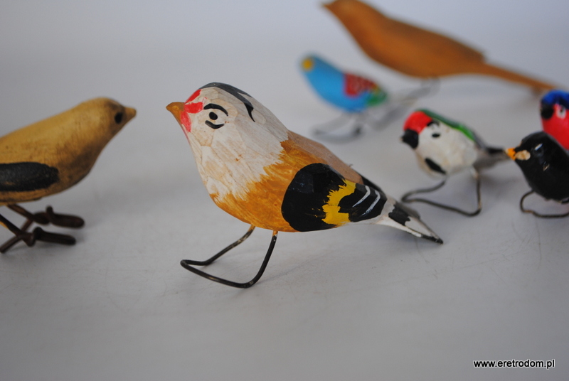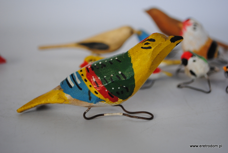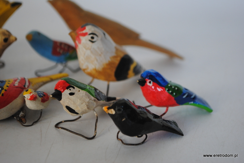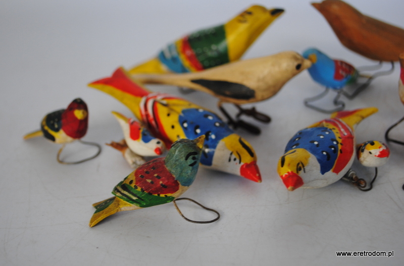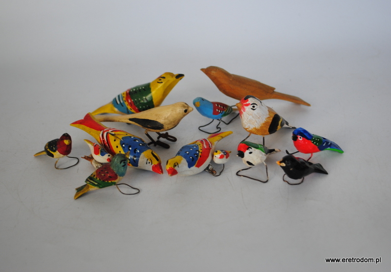 Zestaw 14 ptaszków. Polska produkcja z II poł. XXw. Drewno, ręczna malatura. Figurki posiadają druciki dzięki czemu można je swobodnie ustawiać na stojąco.