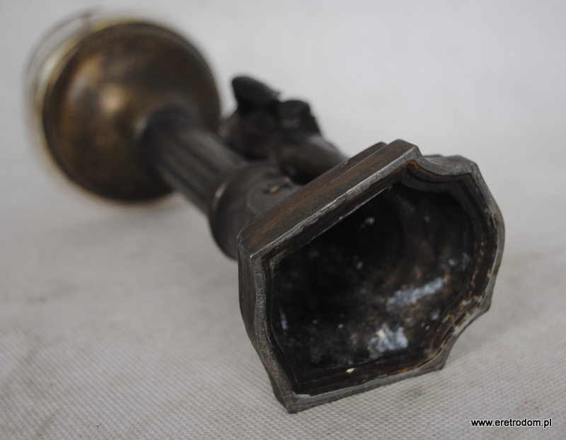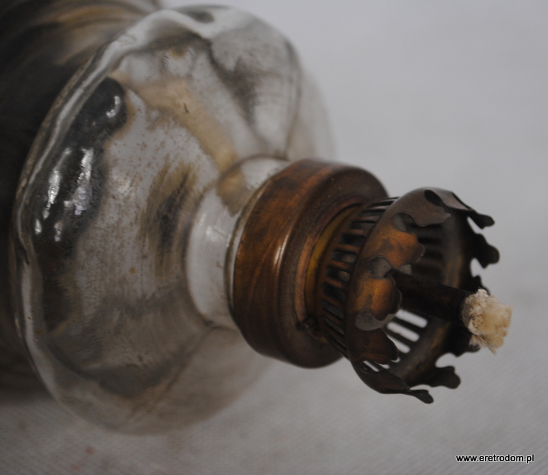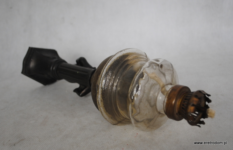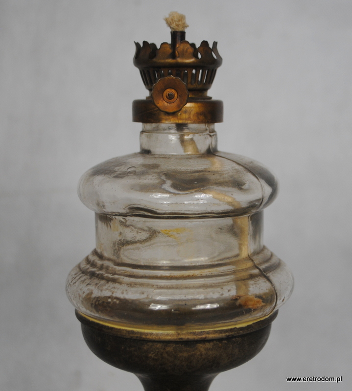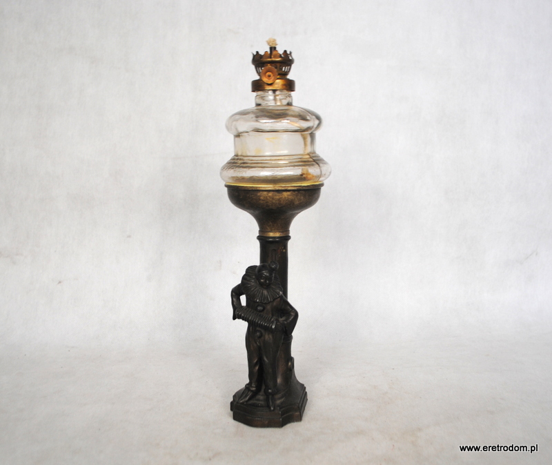 Stareńka figuralna lampa olejna, I poł. XXW. Wykonana z metali, klosz szklany. Podstawa ozdobiona postacią Pierrota z harmonijką. Bardzo ładne wykonanie.