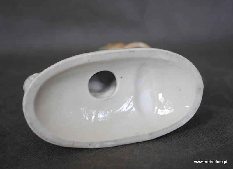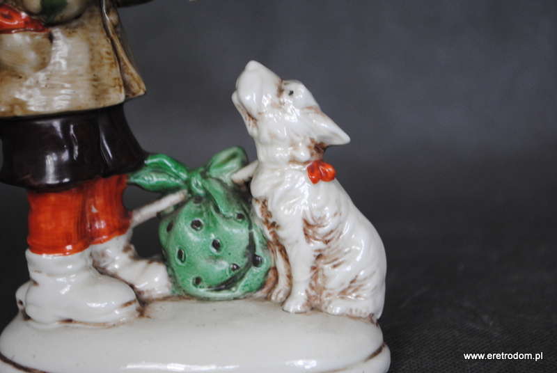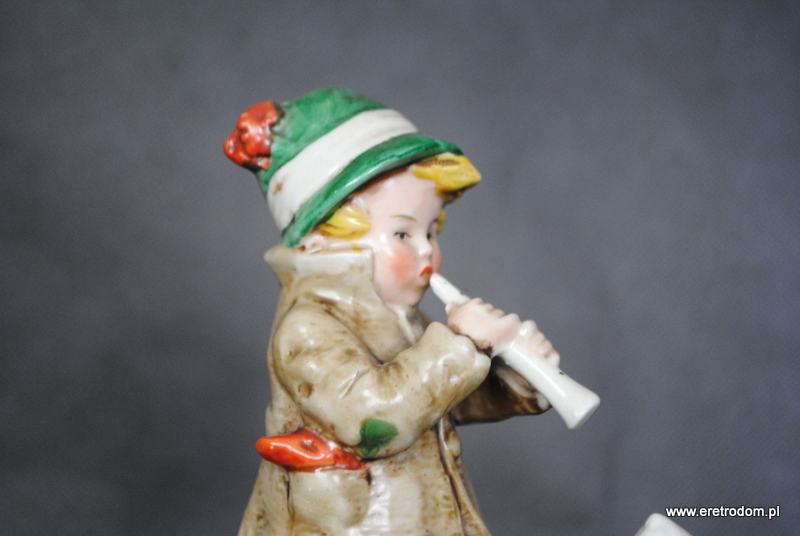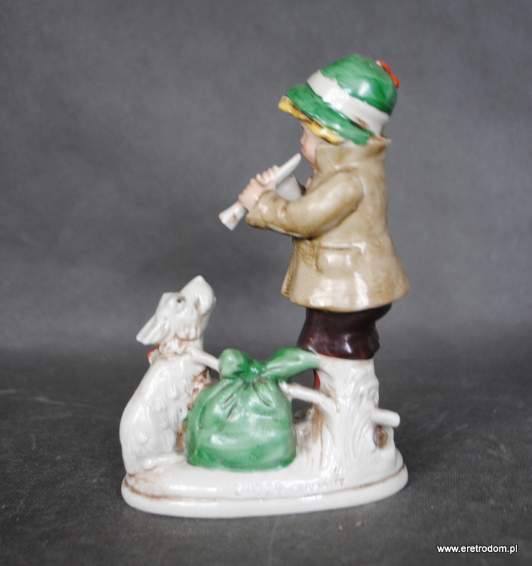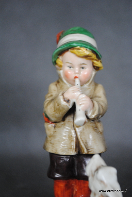 Figurka przedstawiająca chłopca grającego na flecie dla pieska. Biała porcelana ręcznie malowana. W tylnej dolnej części wycisk numeryczny.