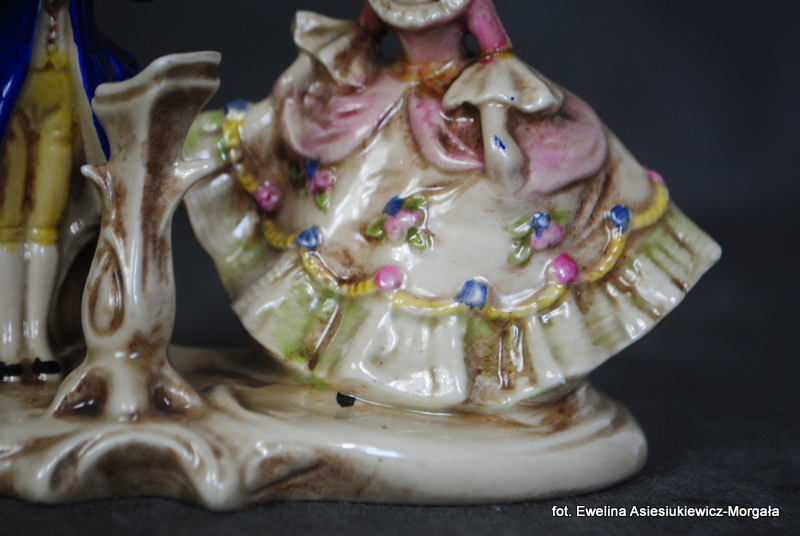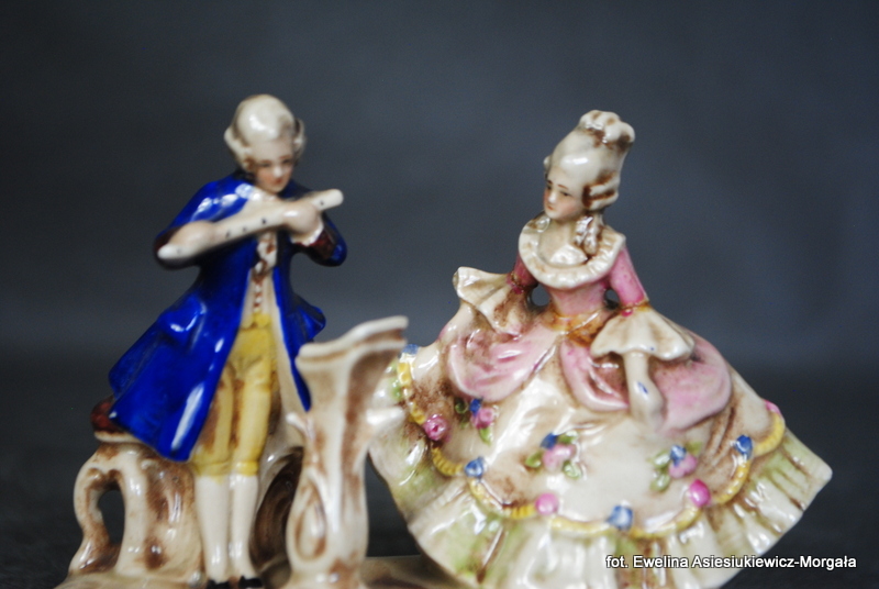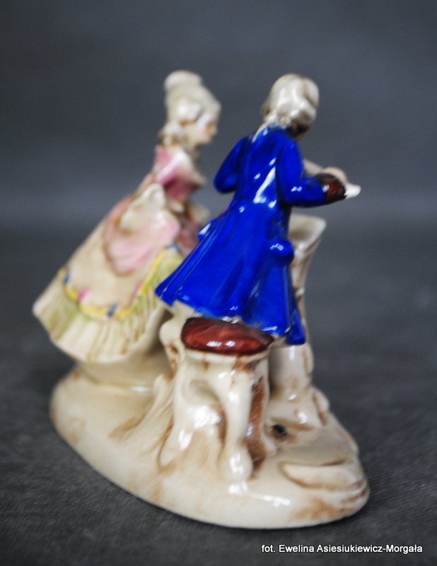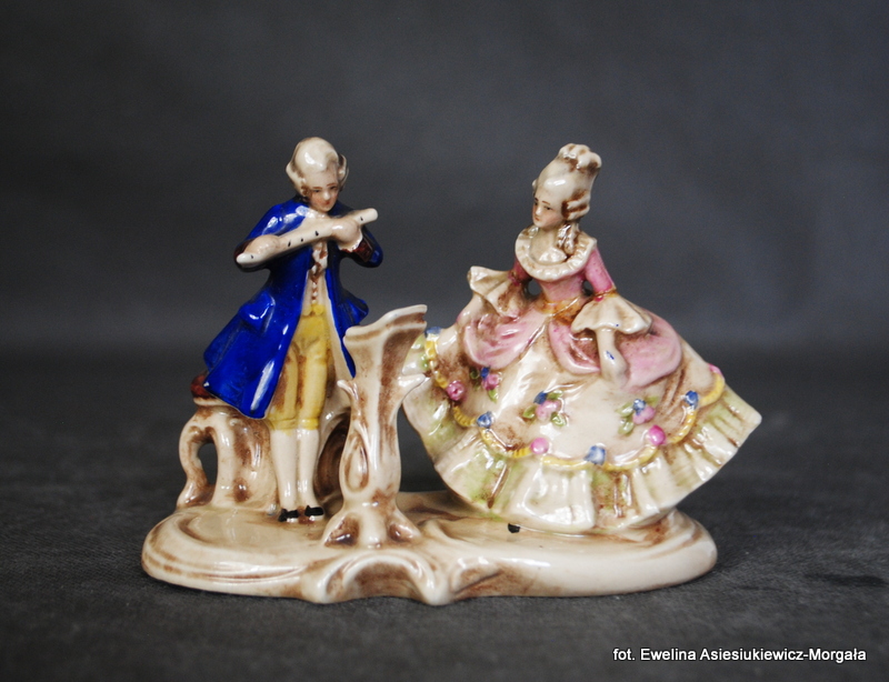 Figurka porcelanowa przedstawiająca parę dworską, muzyka i damę. Od spodu wycisk numeryczny.