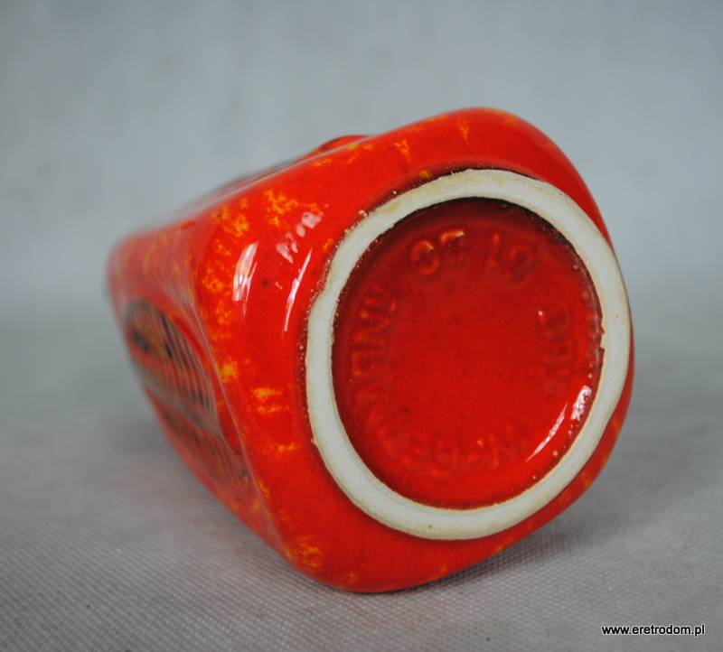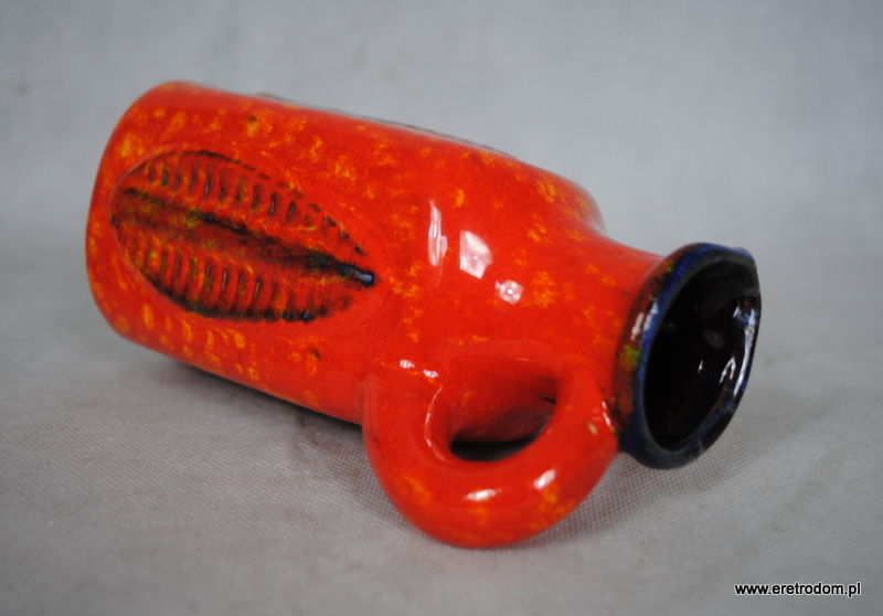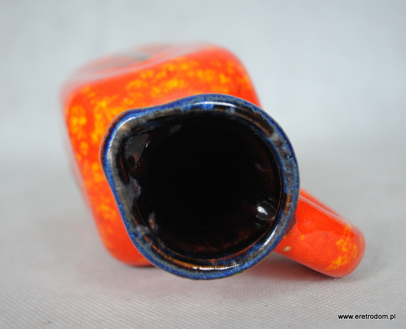 Dzban czy też wazon wyprodukowany w Niemczech w II poł XXw. Ceramika ładnie szkliwiona na soczysty pomarańczowy kolor, rant granatowy.