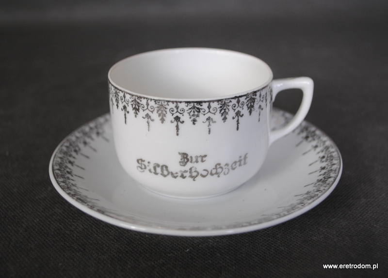 Okazjonalna filiżanka ze spodkiem, Giesche, I poł. XXw. Biała porcelana srebrzona.
