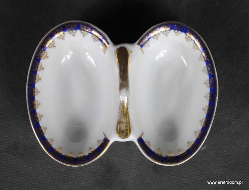 Przyprawnik, solniczka, kabarecik produkcja Giesche lata 1929-1939.. Biała porcelana, rant zdobiony wzorem w kolorze granatu, złocony.
