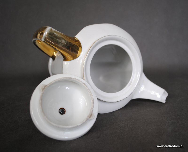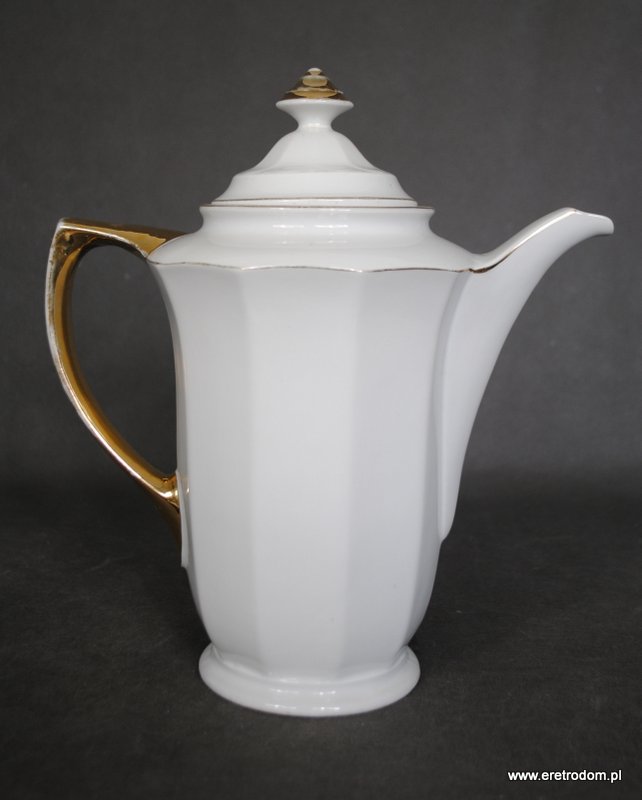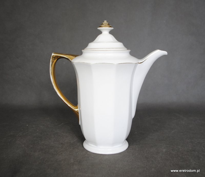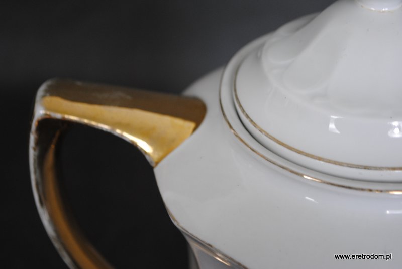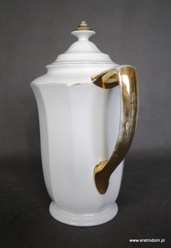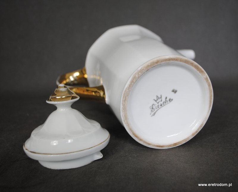 Spory dzbanek sygnowany Giesche. Sygnatura z lat 1929-1939. Biała, delikatna porcelana ozdobiona złoceniami.