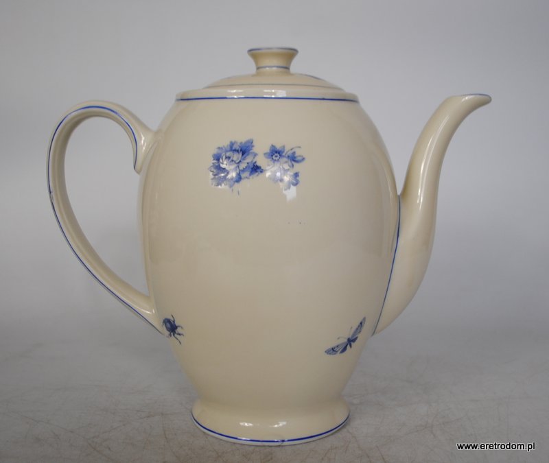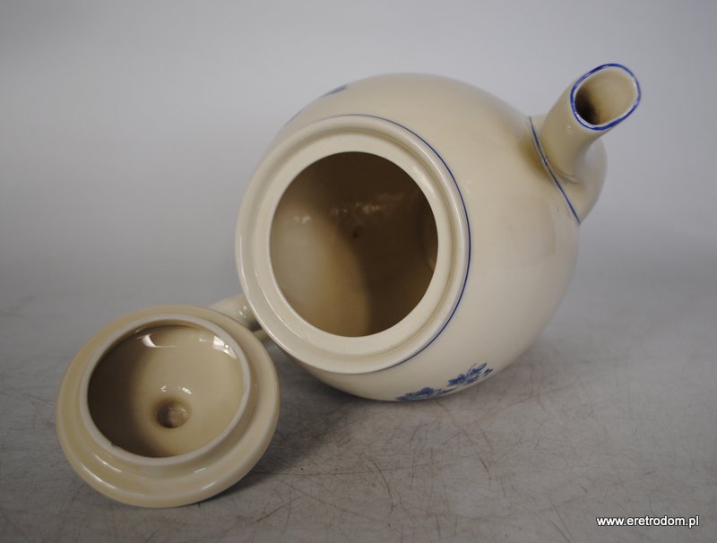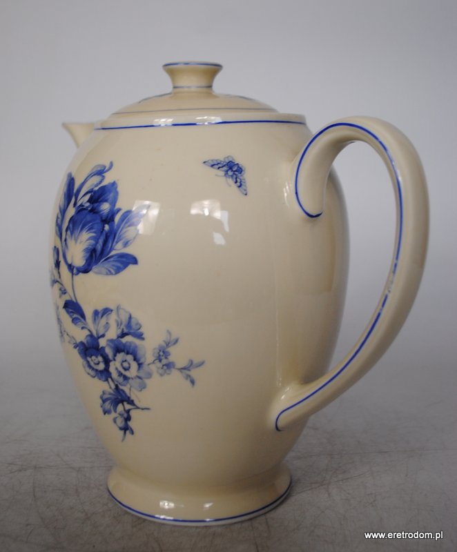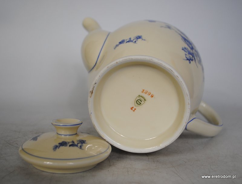 Dzbanek, I poł. XX w. Giesche. Biała, dość delikatna porcelana ozdobiona kalką, rant ręcznie malowany.