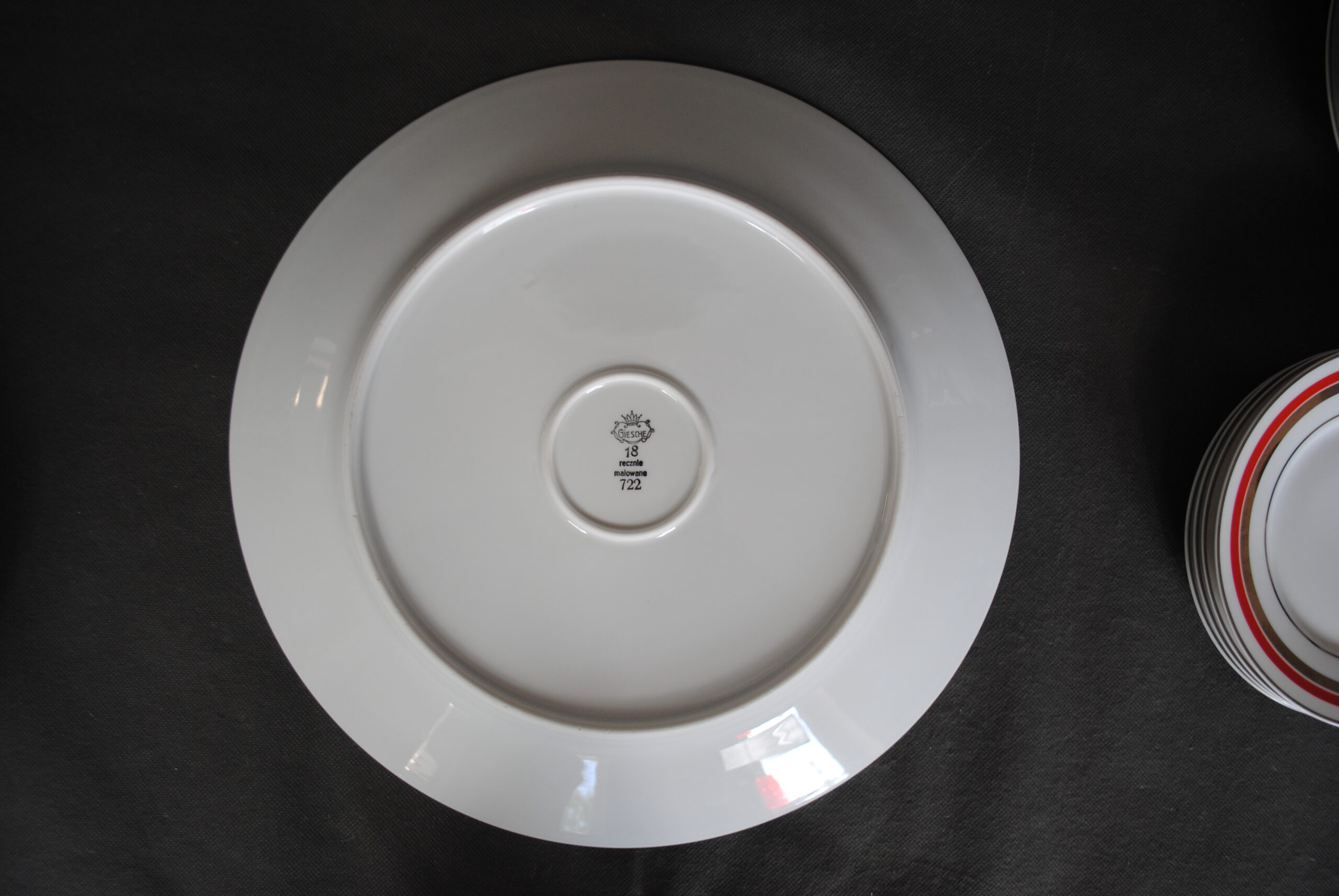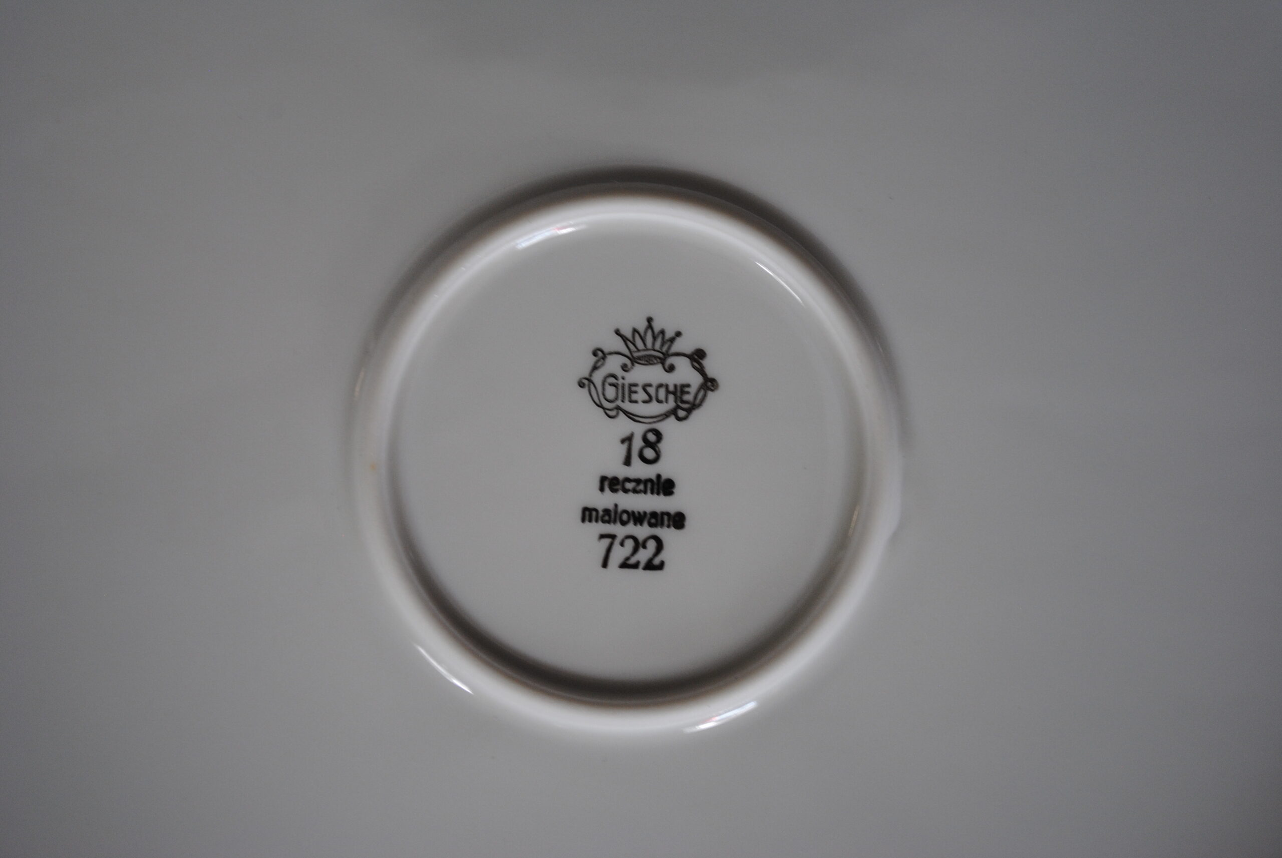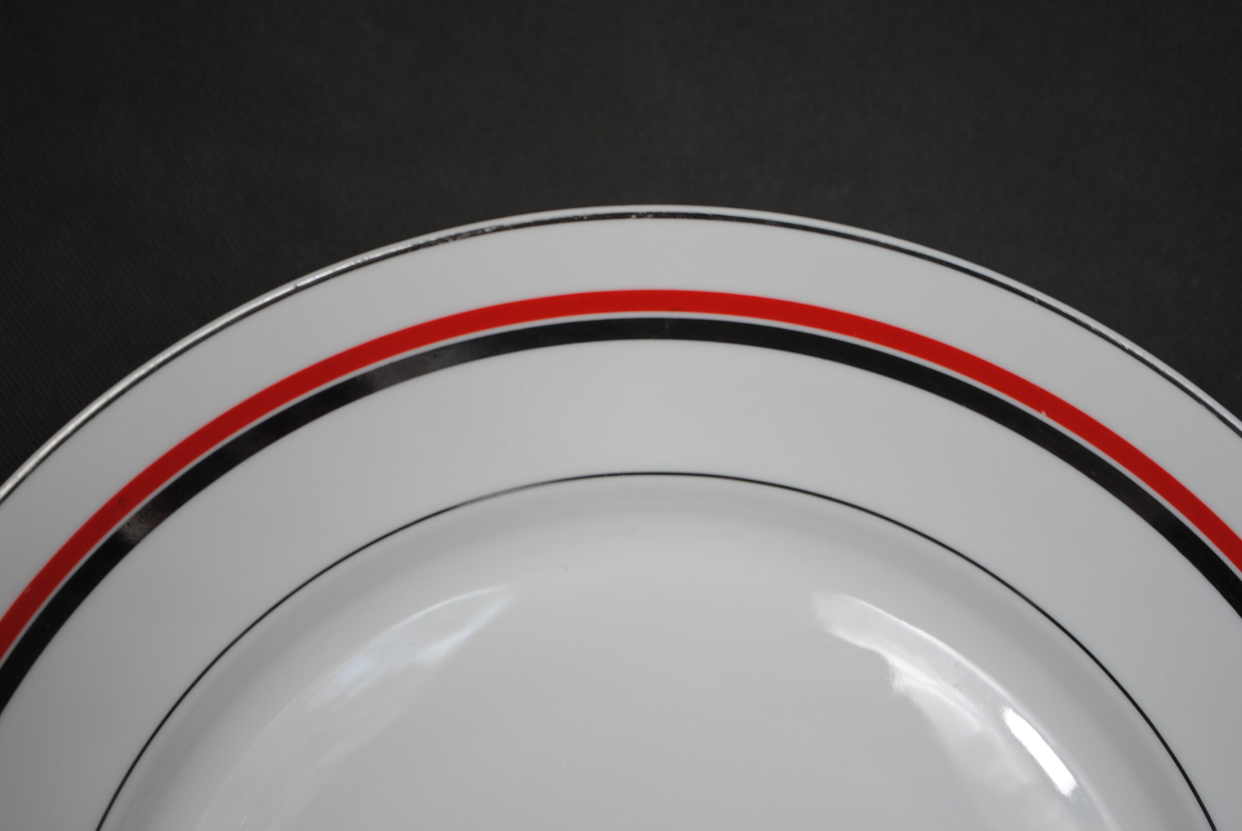 Półmisek/ talerz okrągły sygnowany Giesche fason Wanda (sygnatura 1929-1939r.). Biała, delikatna porcelana ozdobiona czerwonym oraz srebrnym paskiem przy rancie.
