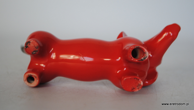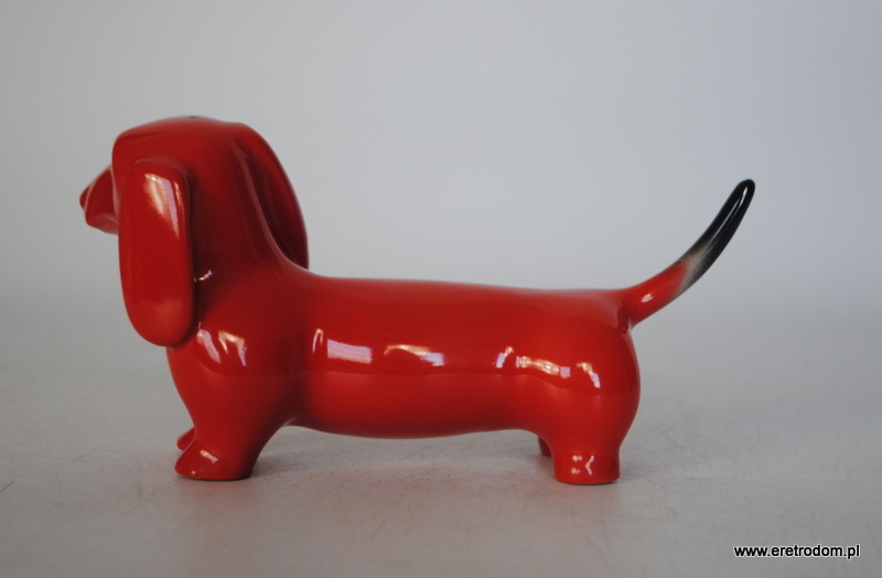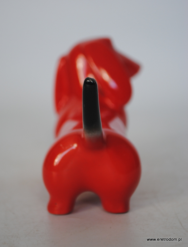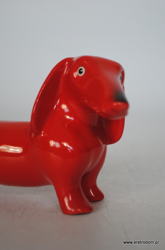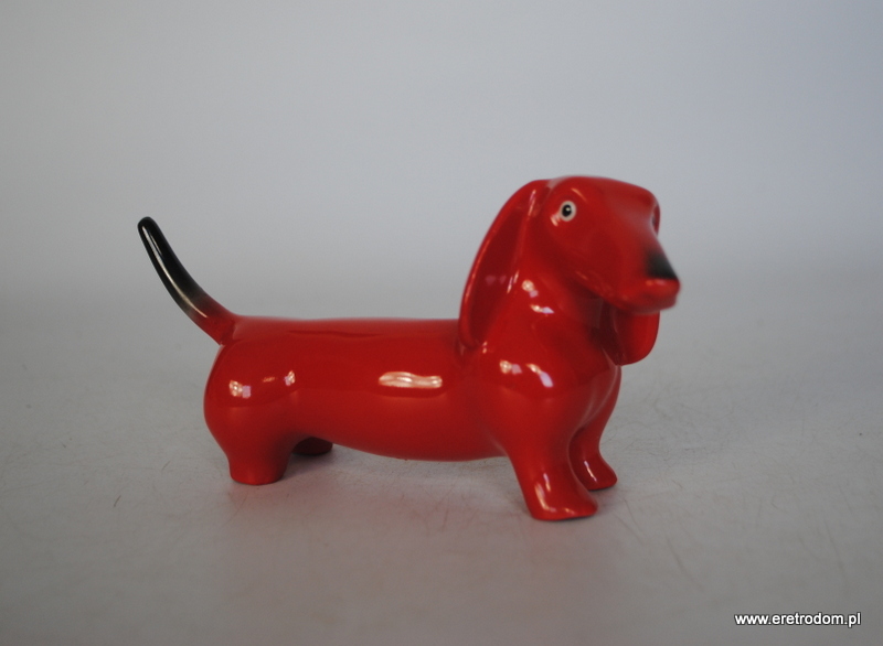 Figurka przedstawiająca jamnika. Najprawdopodobniej wyrób pochodzi z I poł. XXw z fabryki Giesche. Porcelana malowana natryskowo.