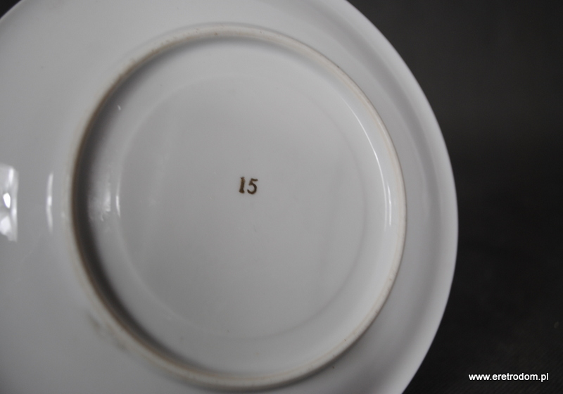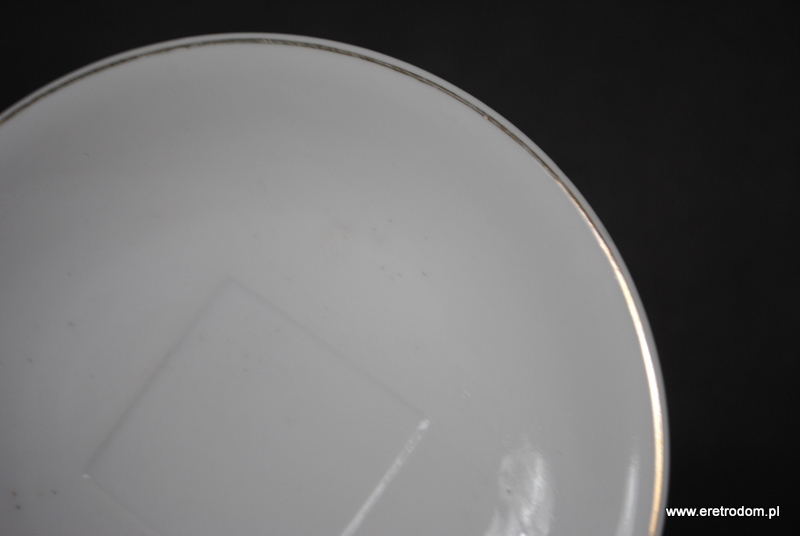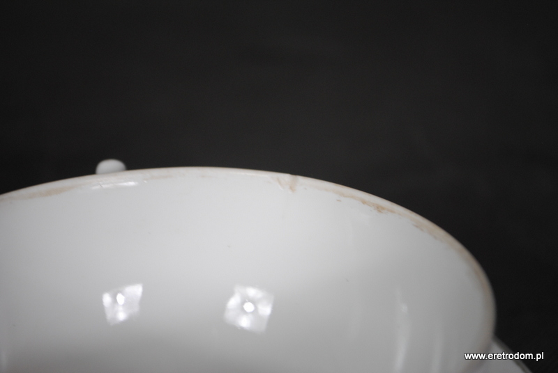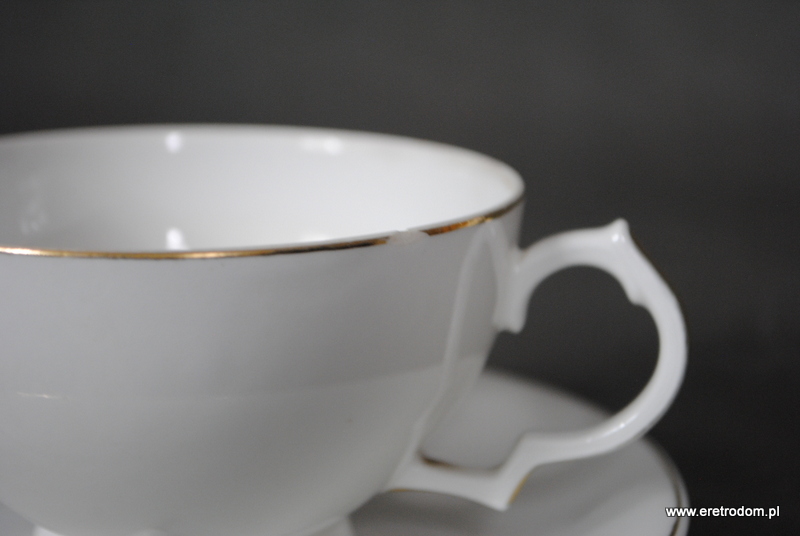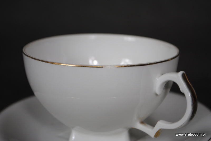 Stan dobry, przetarcia złocenia, drobne ryski, odprysk na rancie filiżanki.