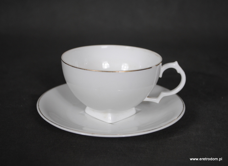 Filiżanka ze spodkiem wyprodukowana w Fabryce porcelany Giesche w I poł XXw. Fason Krystyna o wpadającym w nurt Art Deco kształcie kuli. Biała, delikatna porcelana zdobiona złotem.