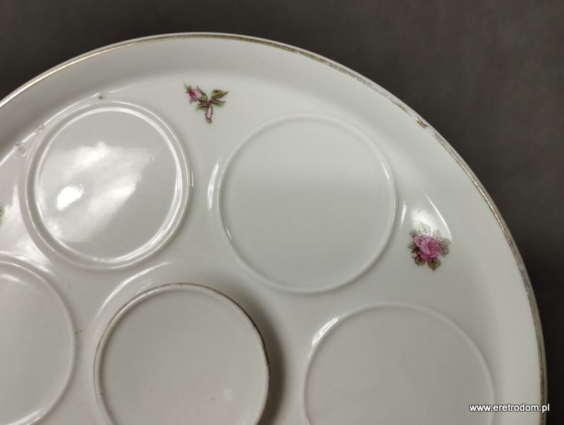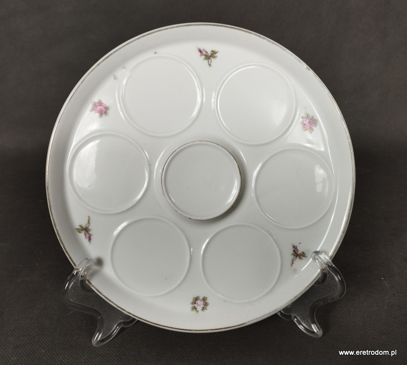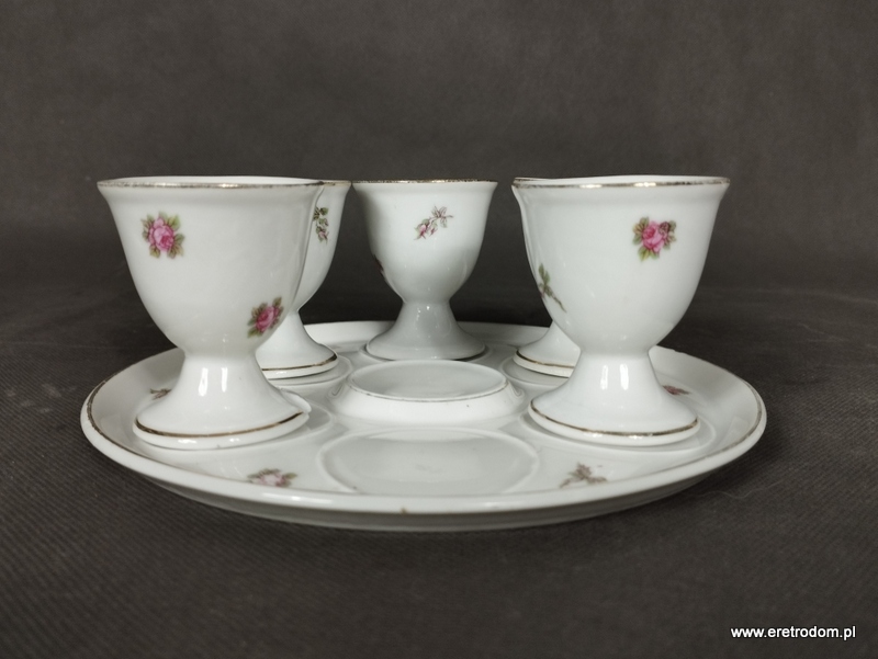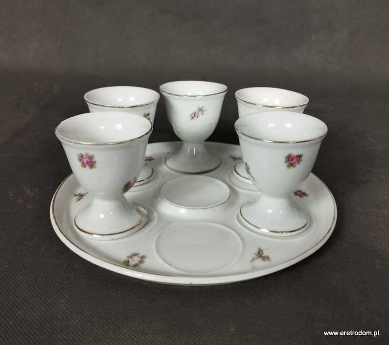 Kieliszki na jajka ( 5 sztuk) oraz taca wyprodukowane przez manufakturę Giesche (lata 1929-1939) Biała porcelana ozdobiona kalką kwiatową, złocona. Od spodu sygnatura producenta.
