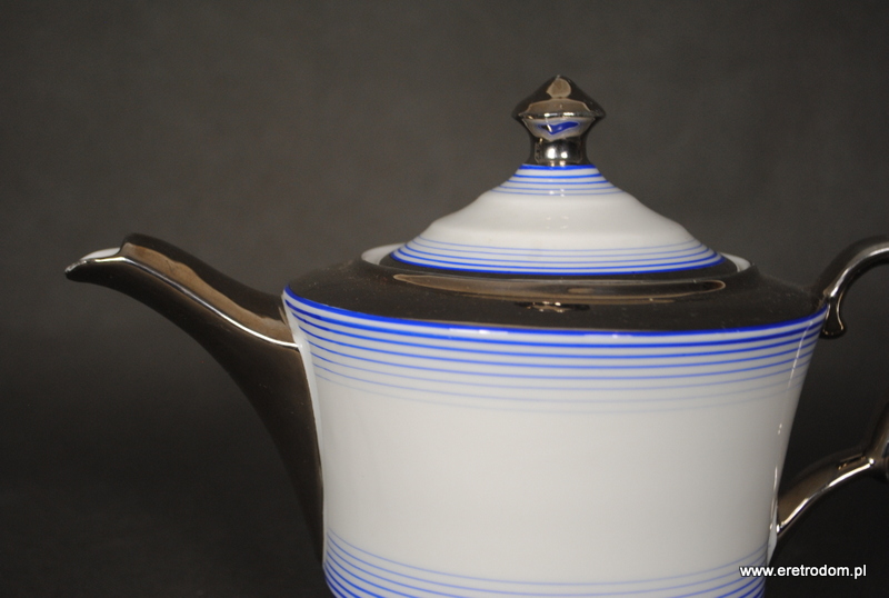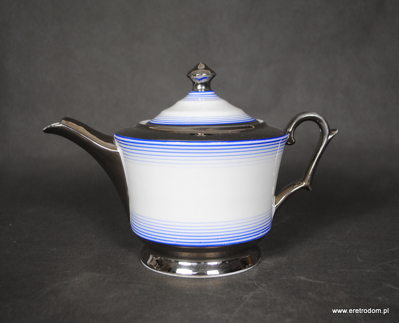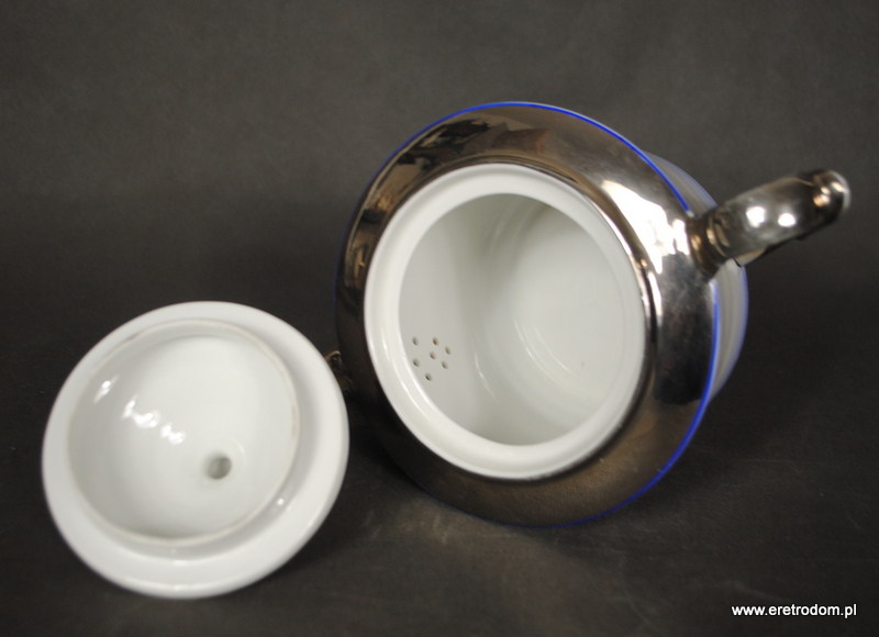 Dzbanek, imbryk do herbaty sygnowany Giesche, Fason Łucja. Stara śląska porcelana w białym kolorze. Zdobiona niebieskimi i platynowymi pasami.