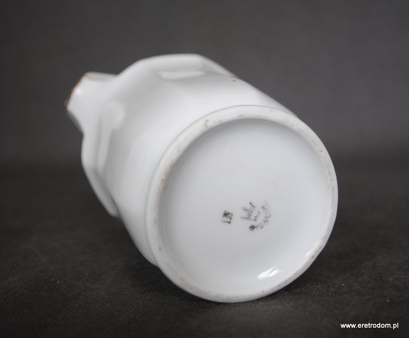 Mlecznik sygnowany Giesche. Sygnatura z lat 1929-1939. Biała, delikatna porcelana ozdobiona złoceniami.