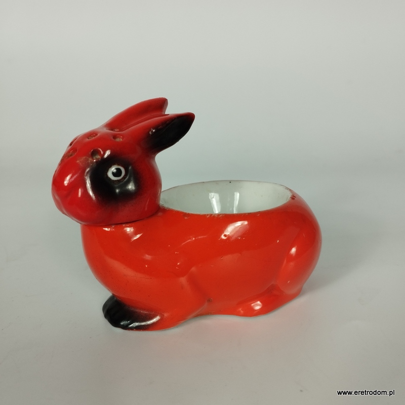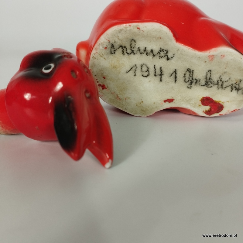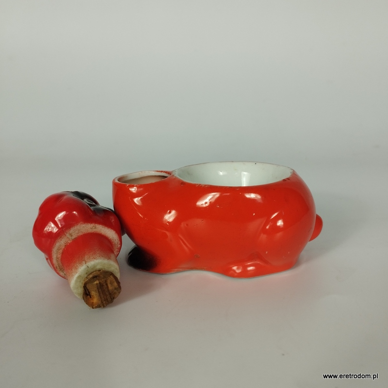 Solniczka figuralna wraz z pojemnikiem na jajko. Wyprodukowana w latach 30 przez fabrykę Giesche ( posiada wypis, brak sygnatury). Porcelana malowana na czerwony kolor, ręcznie malowana. Rzadkość.