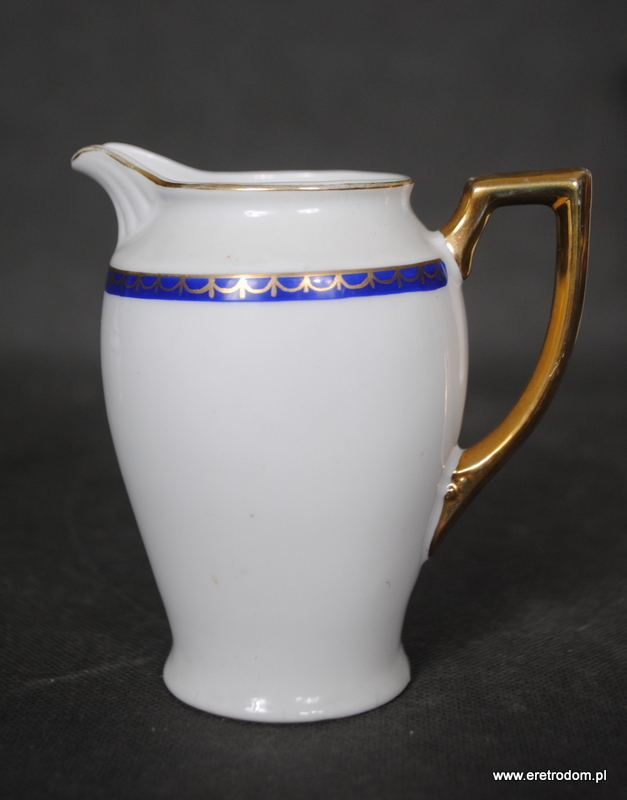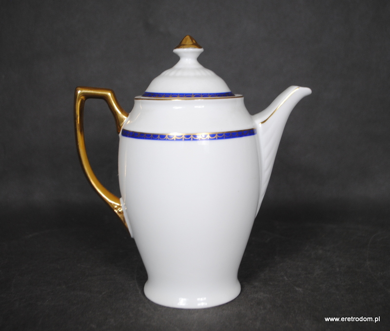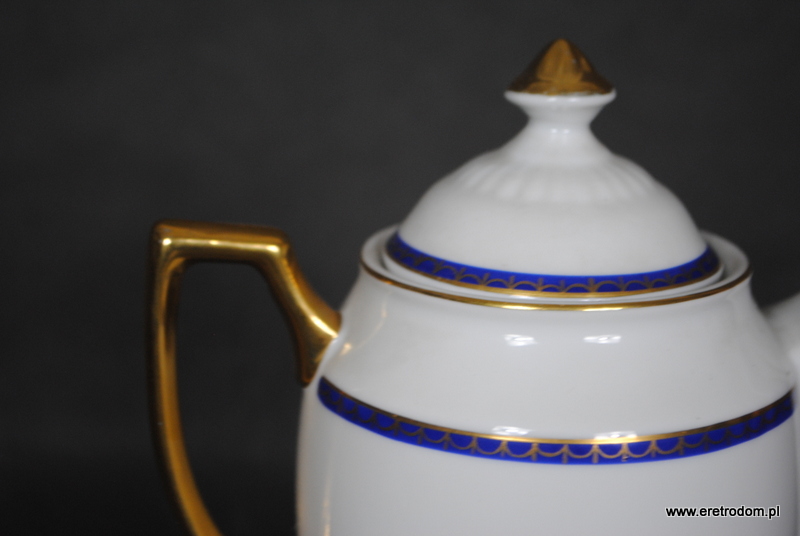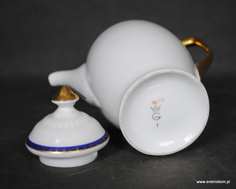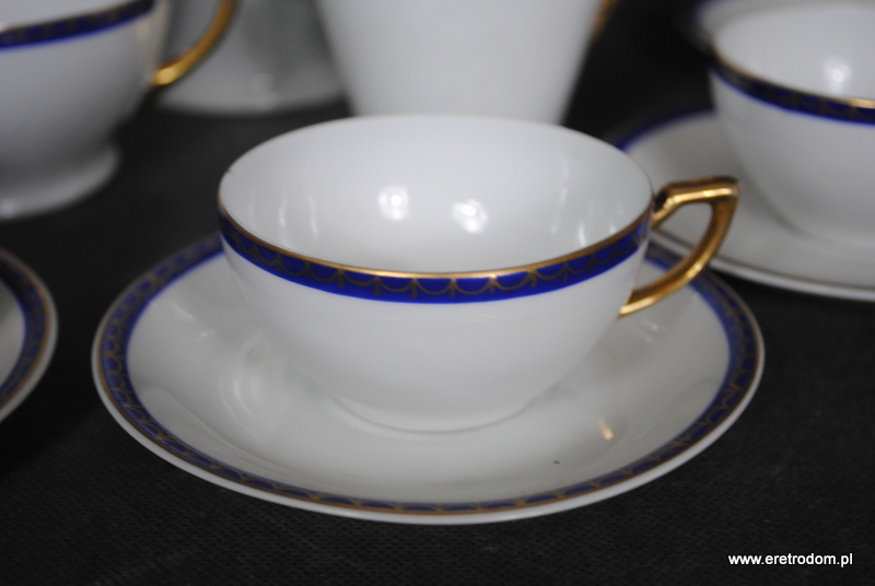 Zestaw porcelany do kawy dla 4 osób. Sygnowany Giesche ( I poł. XXw.). Biała, delikatna porcelana ozdobiona przy rancie szlaczkiem.