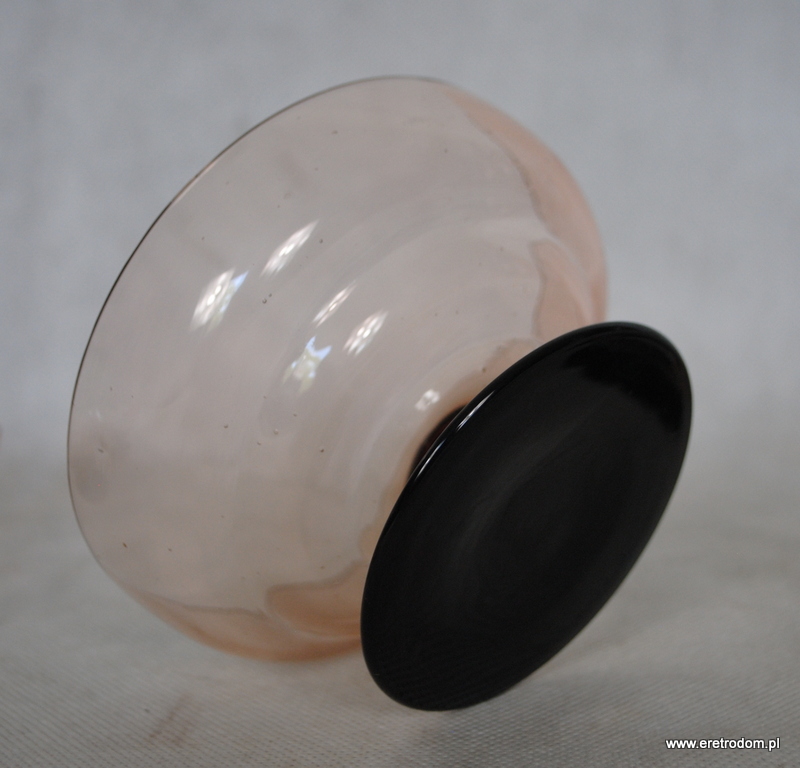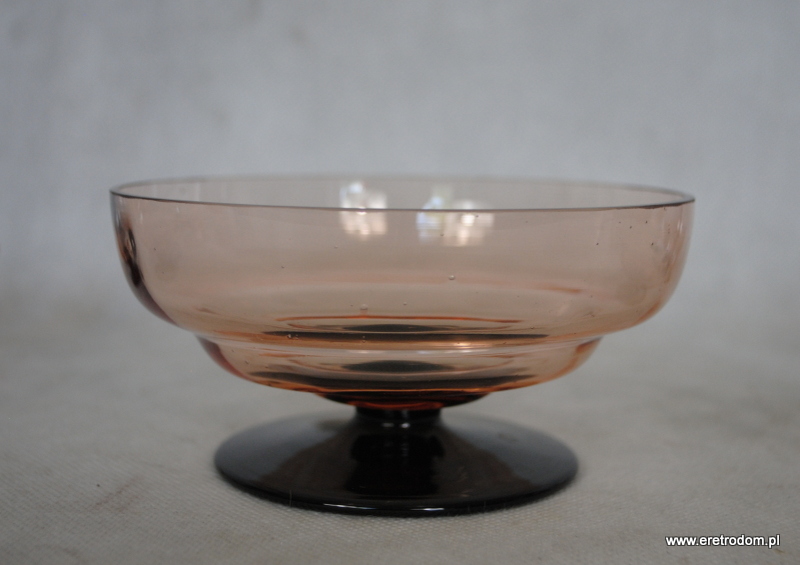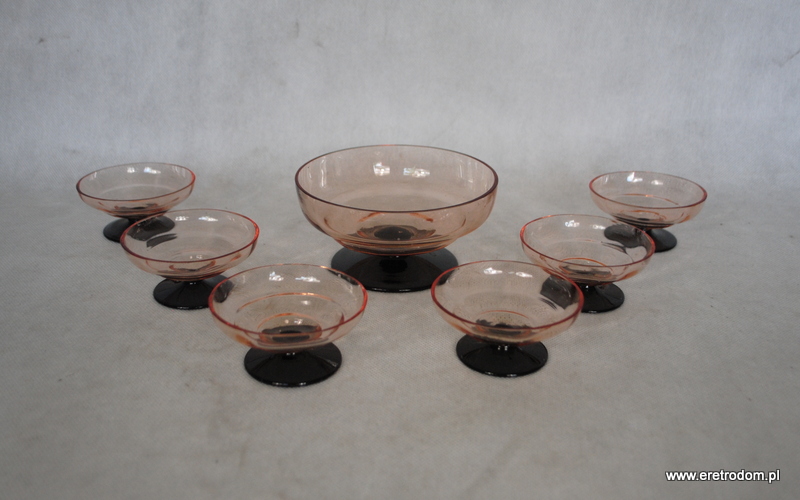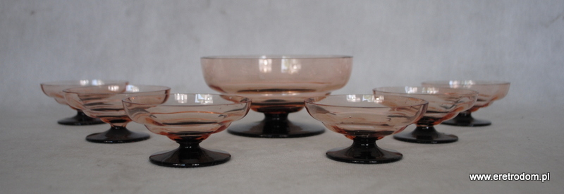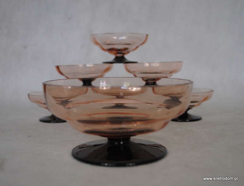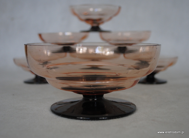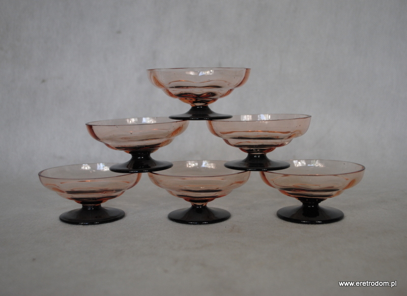 Hortensja, komplet optycznych Kloszyków do lodów. Nr katalogowy to 695. Szkło optyczne, barwione w masie, stopa hialitowa. W skład zestawu wchodzi jeden duży oraz 6 małych kloszyków.
