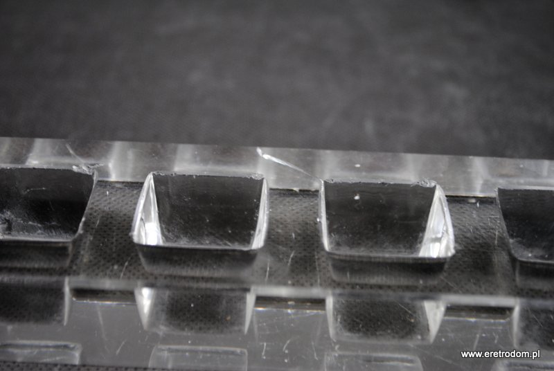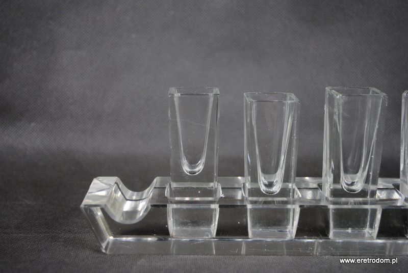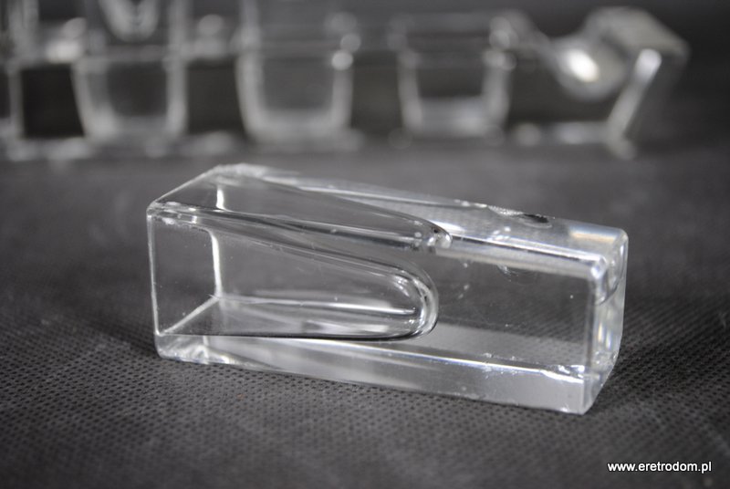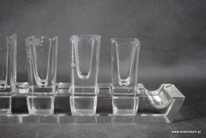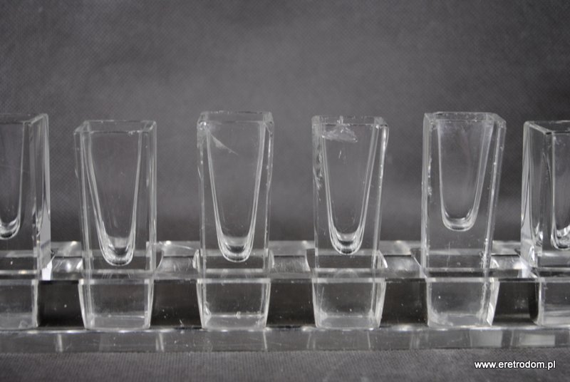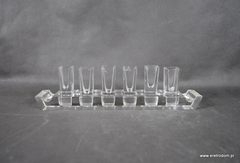 Garnitur do likieru, produkcja Huta Szkła Hortensja, numer katalogowy 119. Szkło transparentne, dość ciężkie. 6 kieliszków oraz toporny stojak.