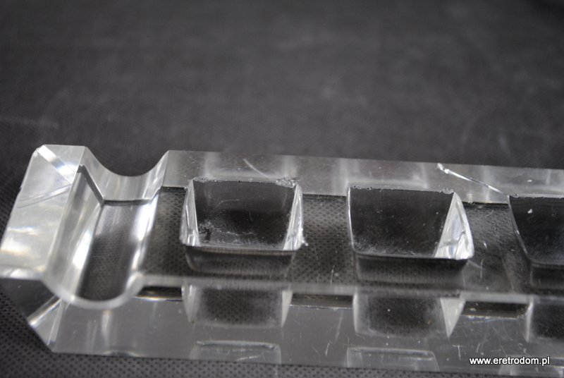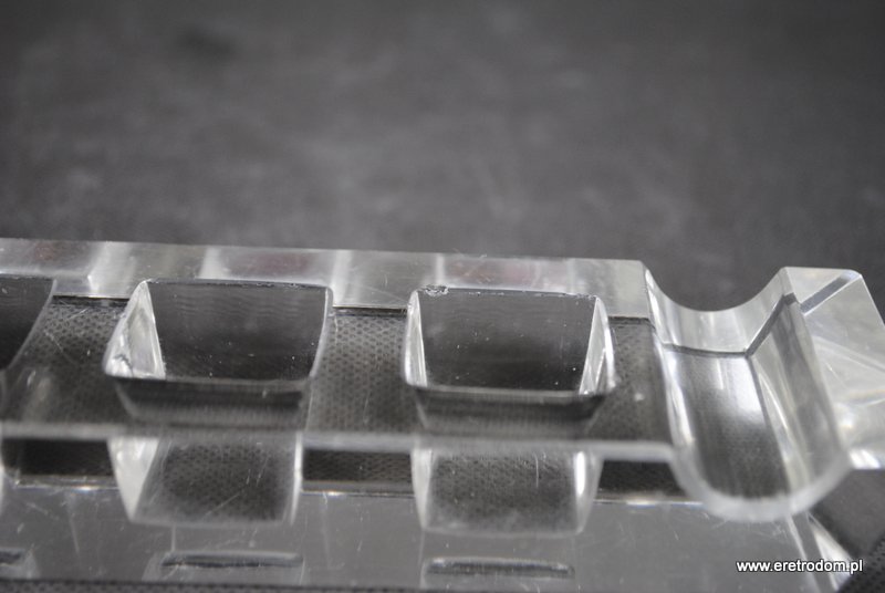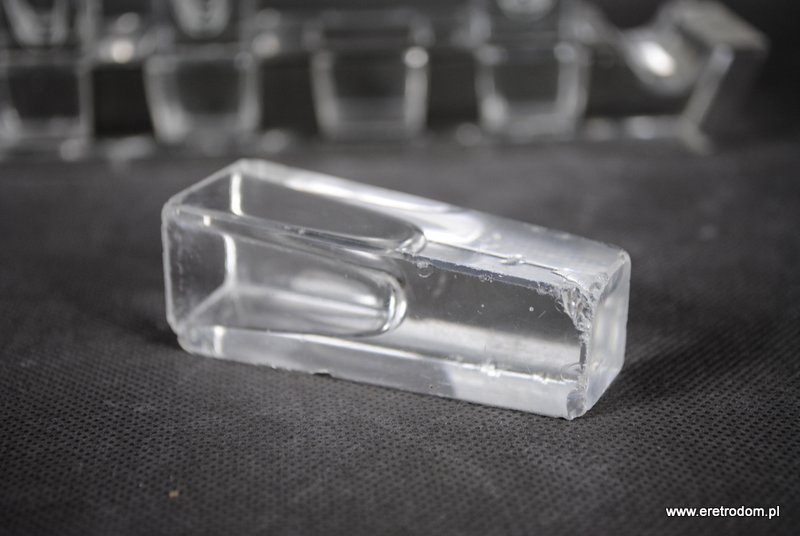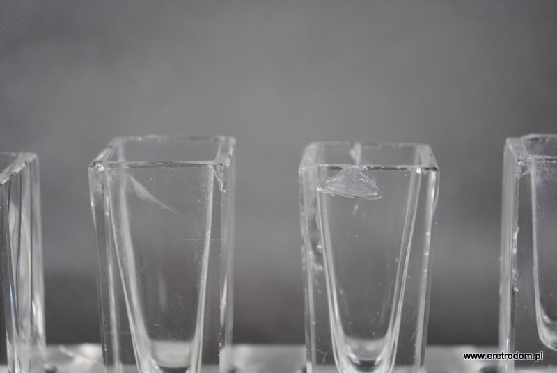 Stan: stojak oraz kieliszki posiadają liczne odpryski. Stojak posiada pęknięcie w środku szkła.