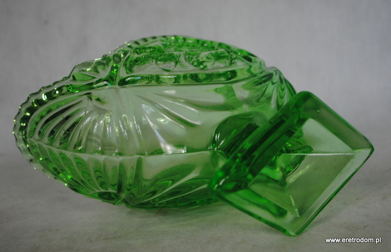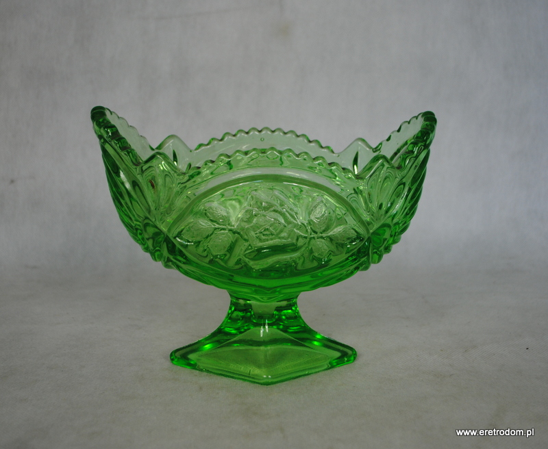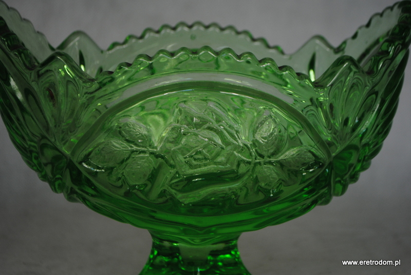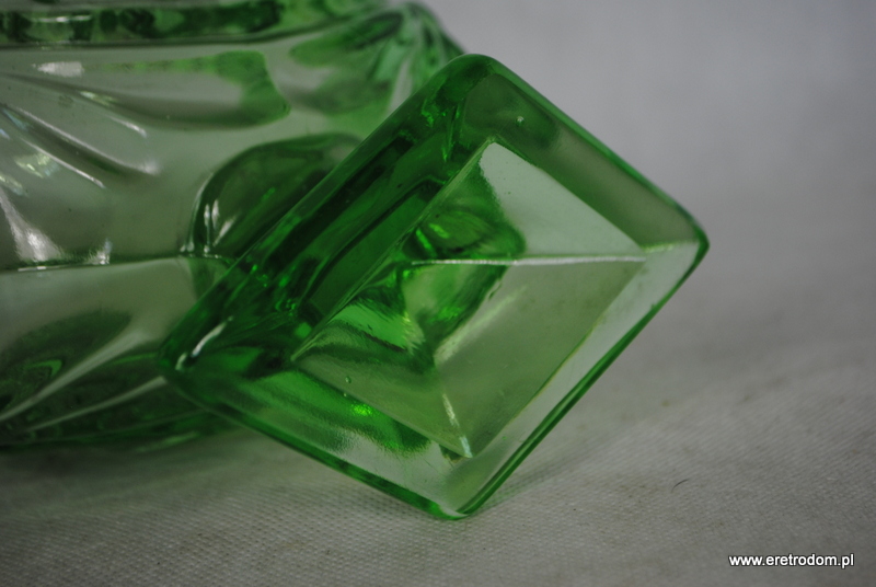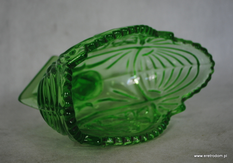 Żardiniera pochodząca z Huty Szkła Gospodarczego Ząbkowice Lub z Huty Szkła Hortensja. Szkło prasowane, barwione w masie na kolor zielony.