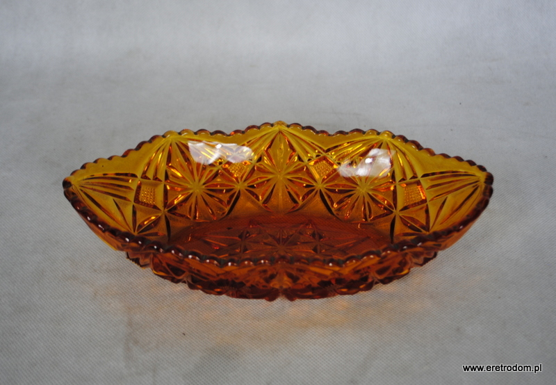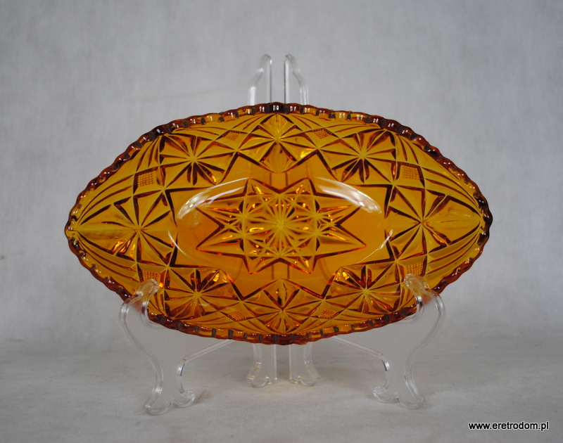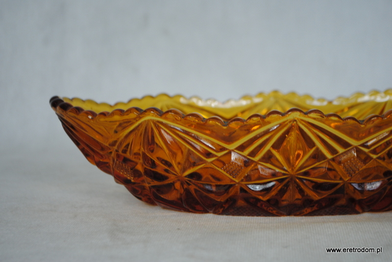 Żardyniera pochodząca z Huty Szkła Hortensja. Szkło prasowane, barwione w masie na intensywny, pomarańczowy kolor.