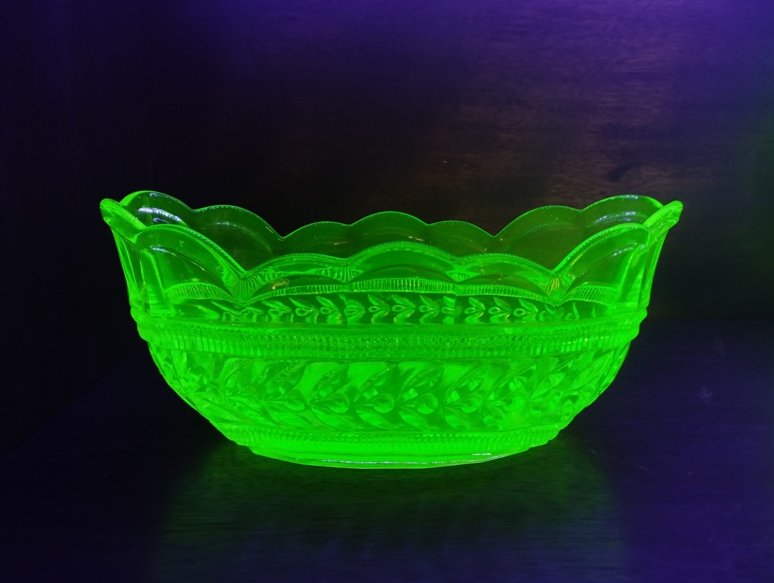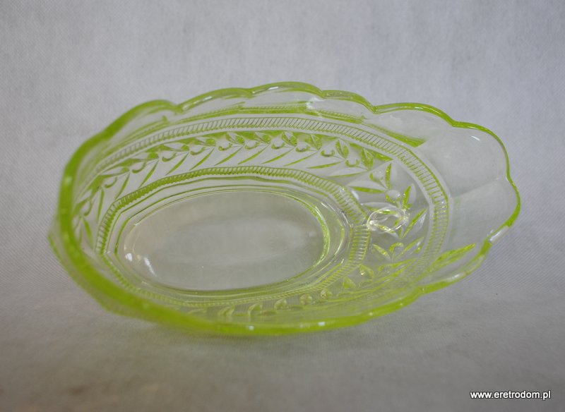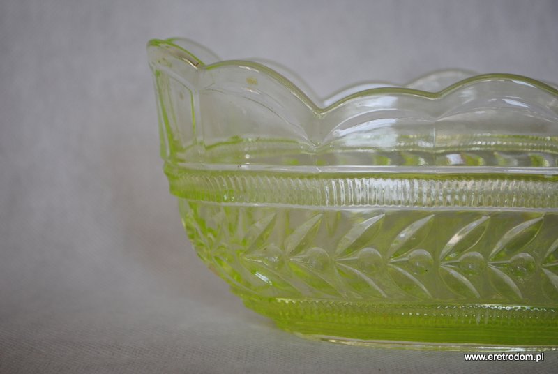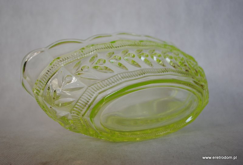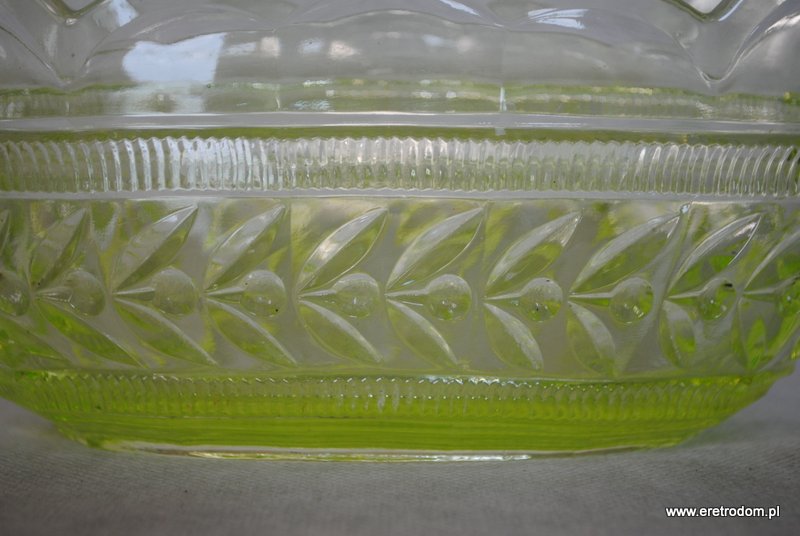 Żardynierka, produkcja Huta Szkła Hortensja. Numer katalogowy to 365. Szkło prasowane, barwione w masie, uranowe.