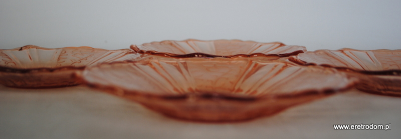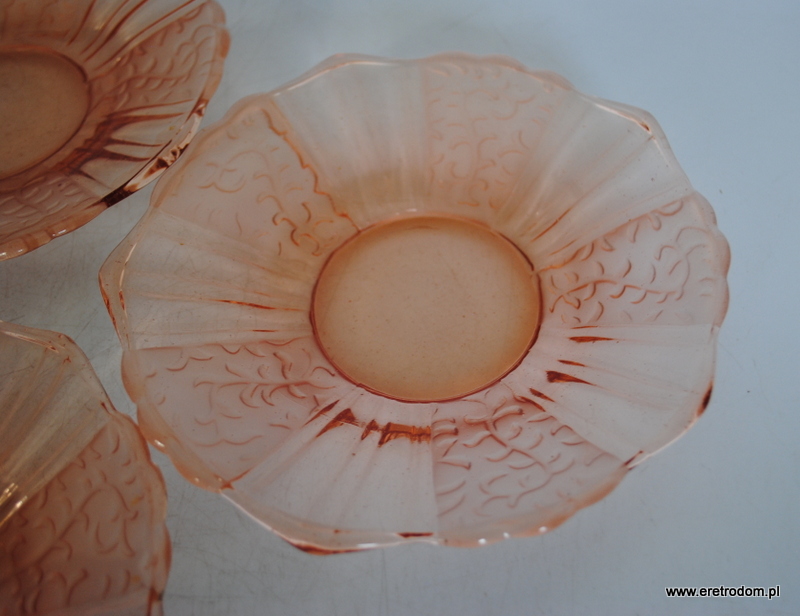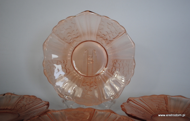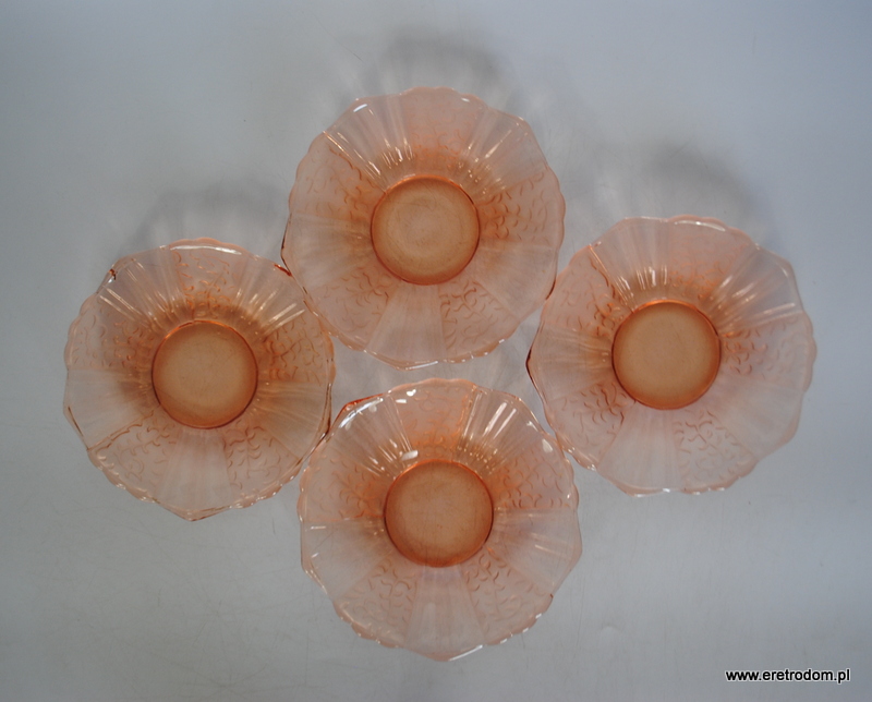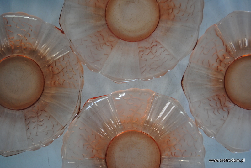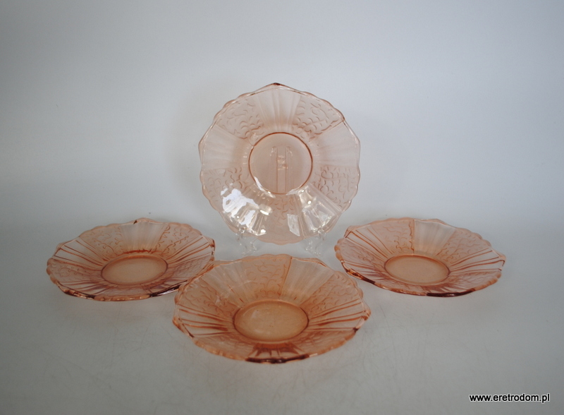 Zestaw 4 talerzyków deserowych. Hortensja? Szkło prasowane, częściowo trawione, barwione w masie.
