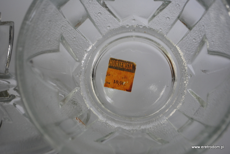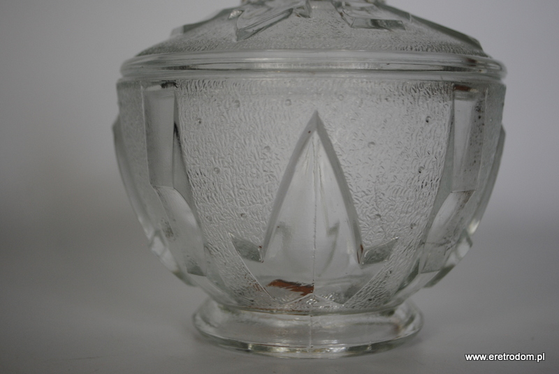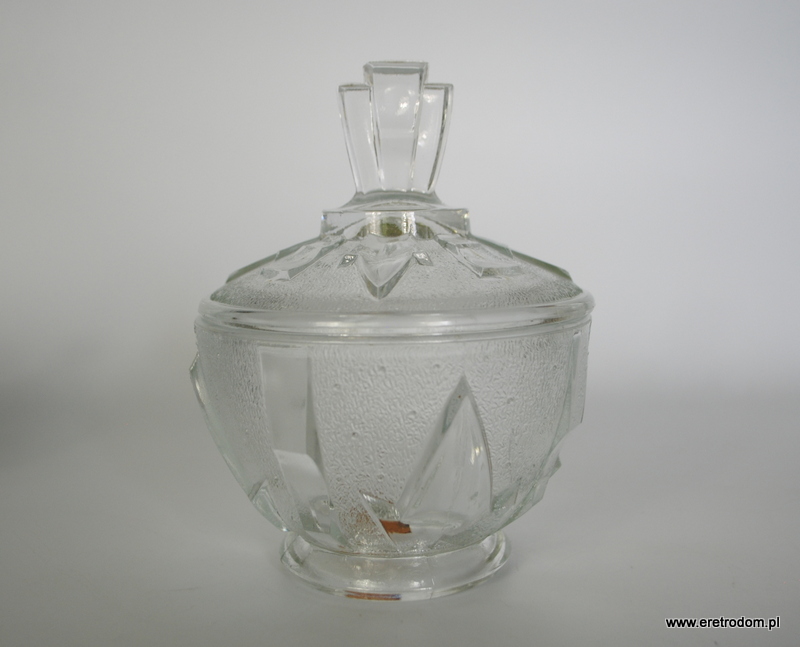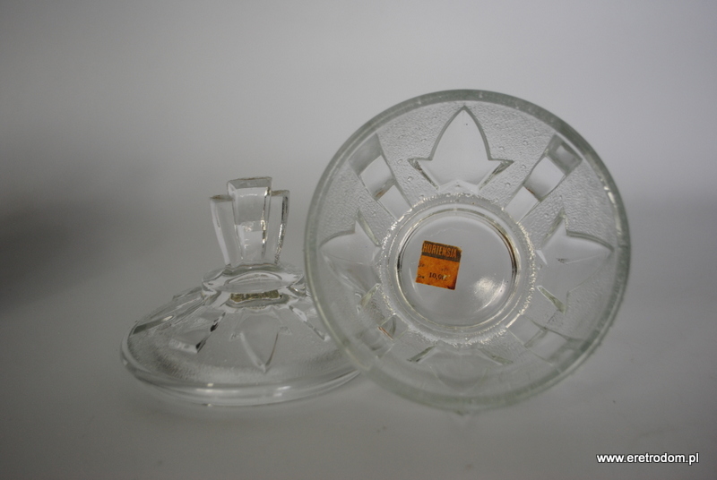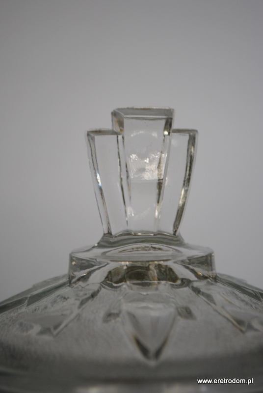 Cukiernica wyprodukowana w HS Hortensja. Szkło prasowane, bezbarwne.
