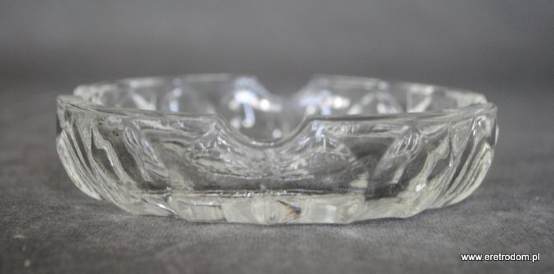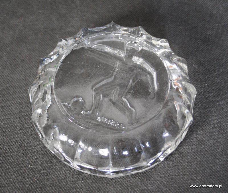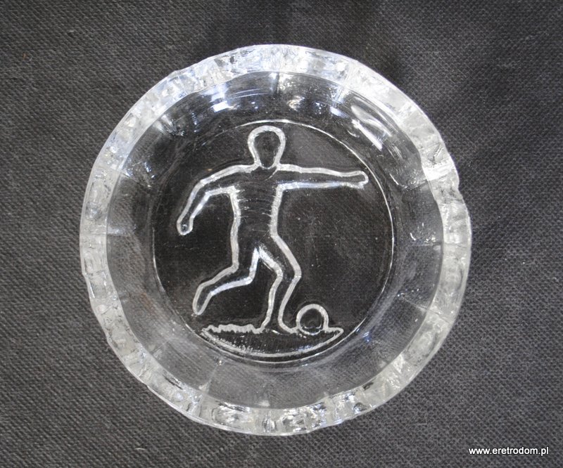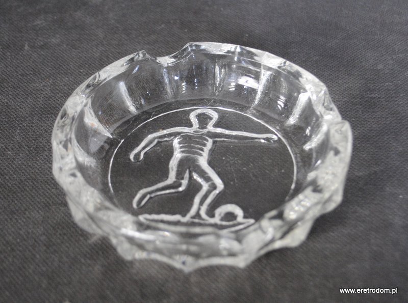 HS Hortensja, popielniczka z piłkarzem nr 412. Szkło prasowane, bezbarwne.