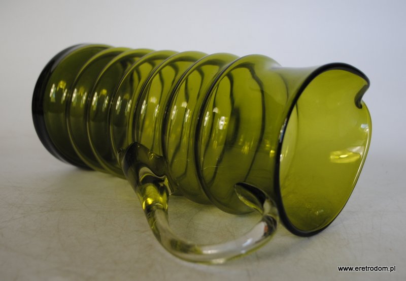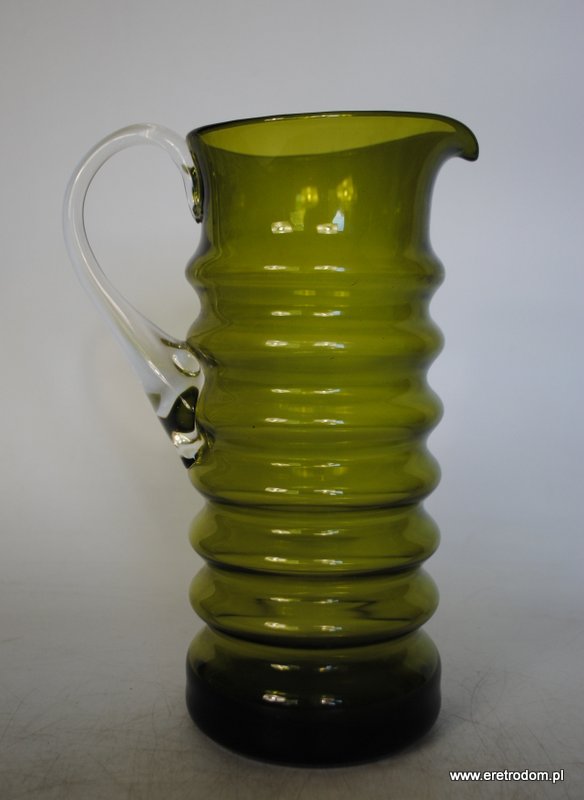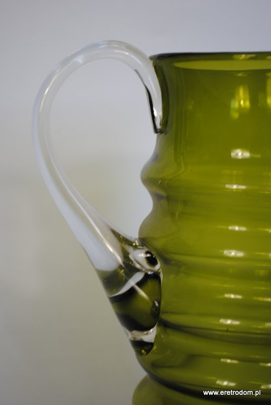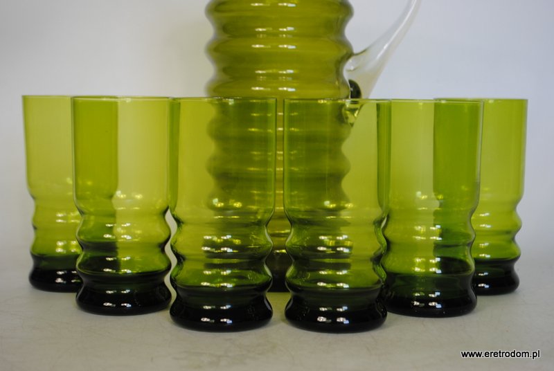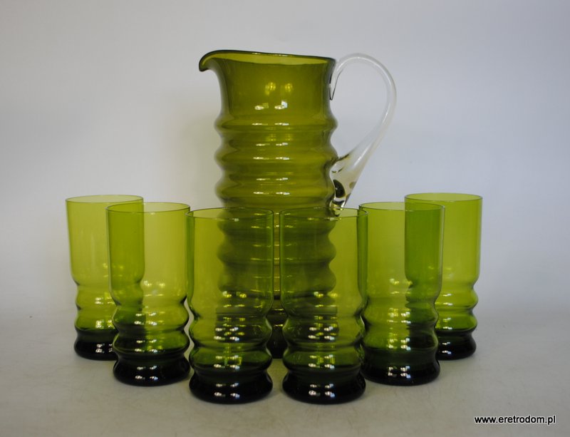 Zestaw do napojów. Najprawdopodobniej wykonany z HS Sudety w II poł. XXw. Szkło barwione w masie. Dzbanek oraz 6 szklanek.