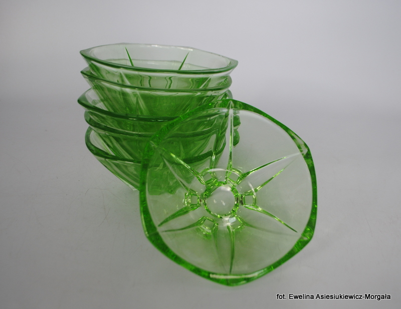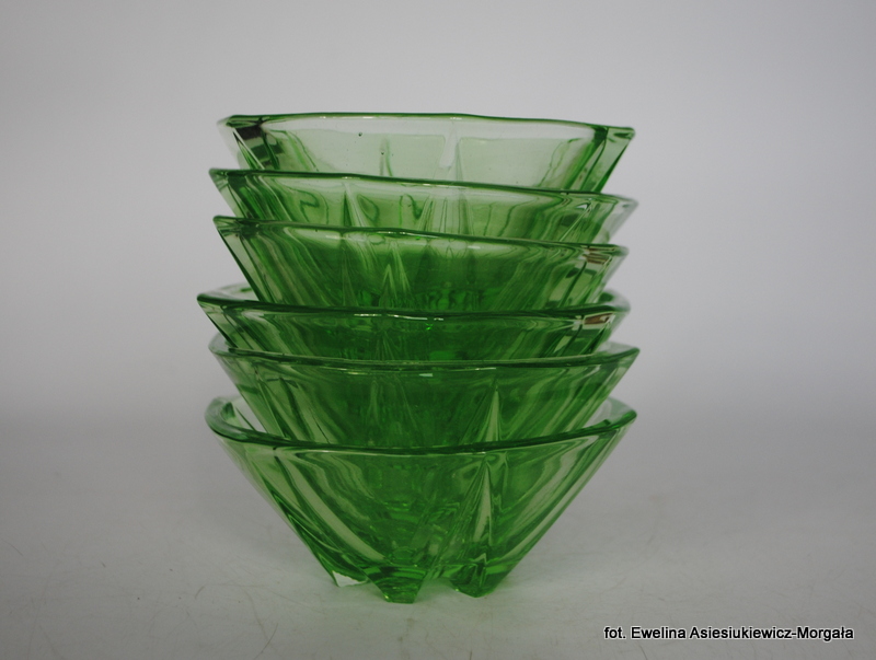 Zestaw 6 miseczek Zaprojektowane przez Bogdana Kupczyka dla HSG Ząbkowice. Fason Sunny. Szkło sodowe, barwione w masie na zielony kolor.