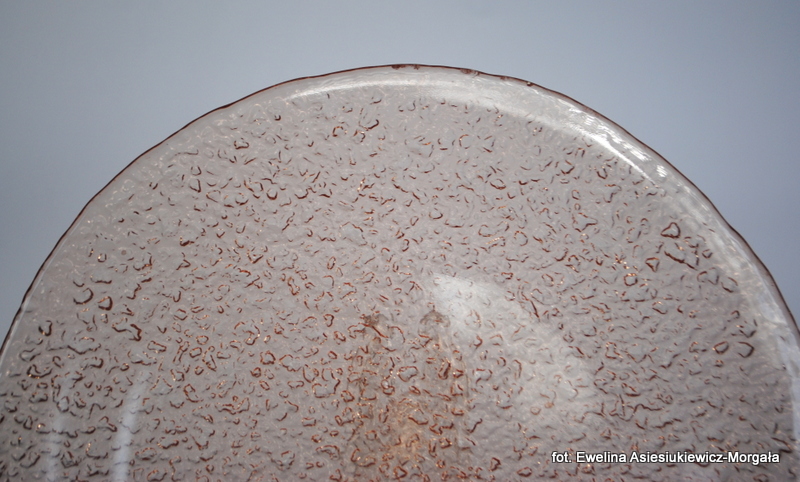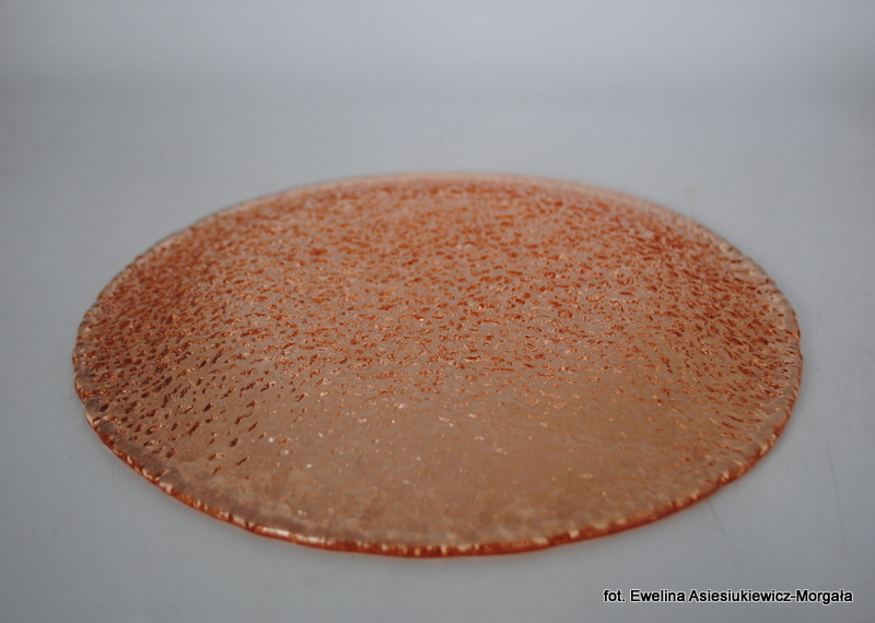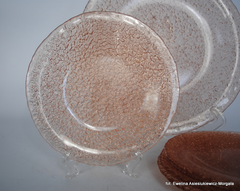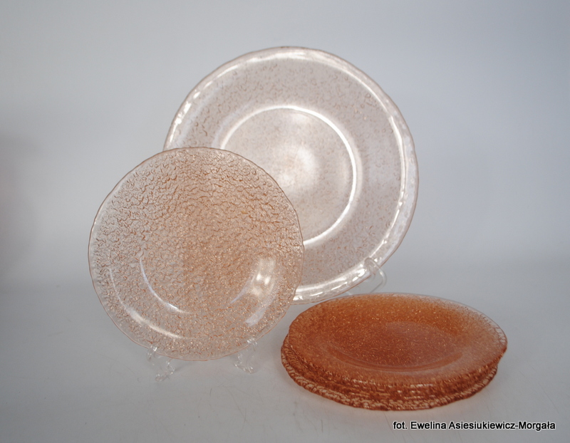 Zestaw do ciasta 5+1, Sahara. HSG Ząbkowice. Szkło sodowe, barwione w masie na łososiowy kolor. Patera oraz 5 talerzyków deserowych.
