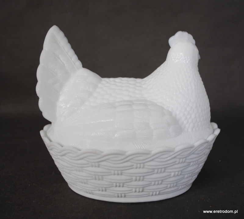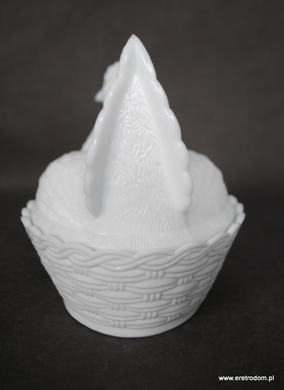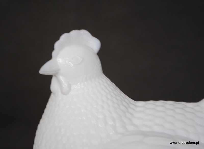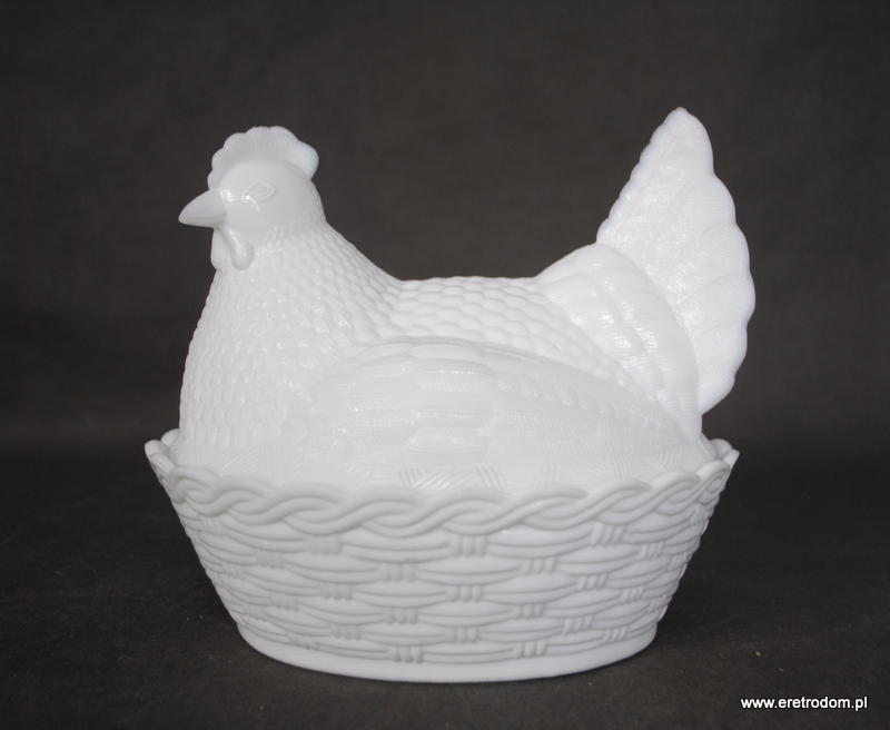 Bomboniera kura, HSG Ząbkowice. Szkło prasowane. barwione w masie na biały kolor – lattimo.