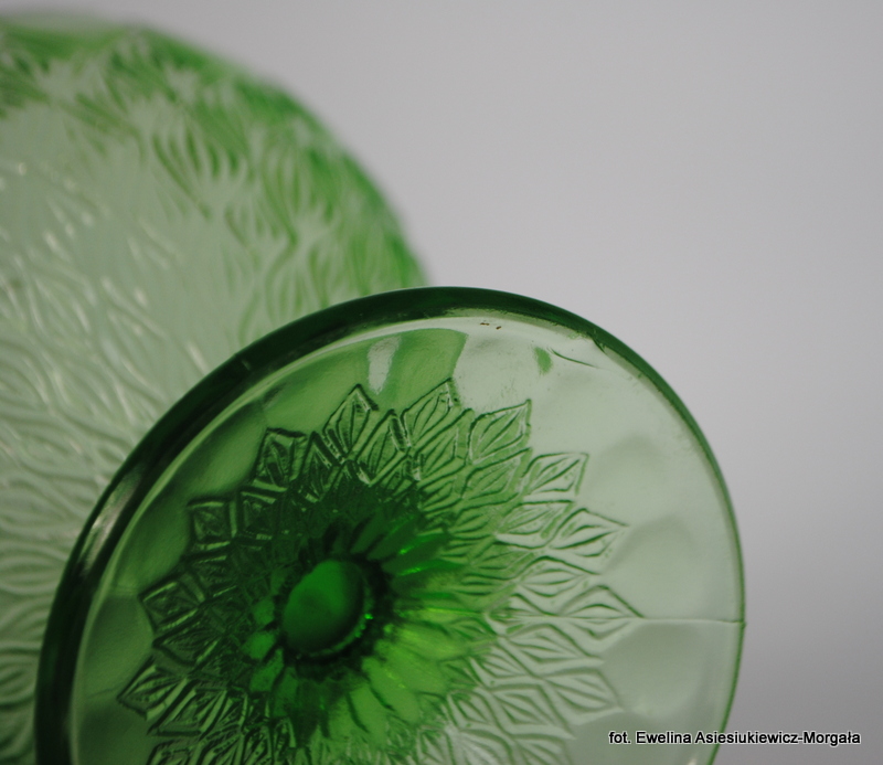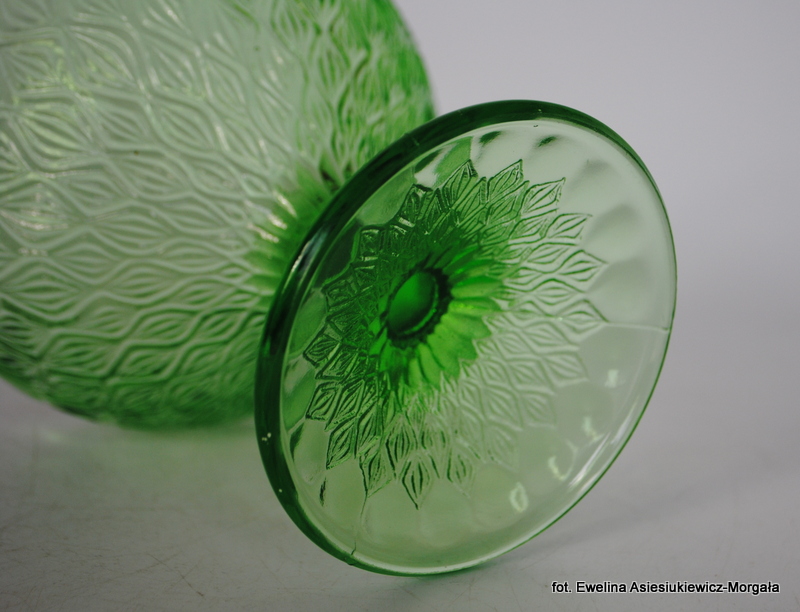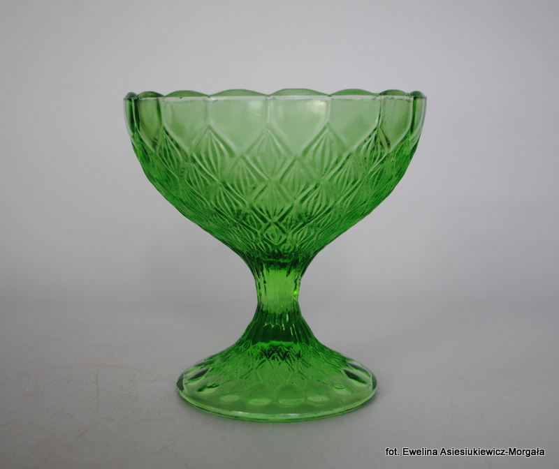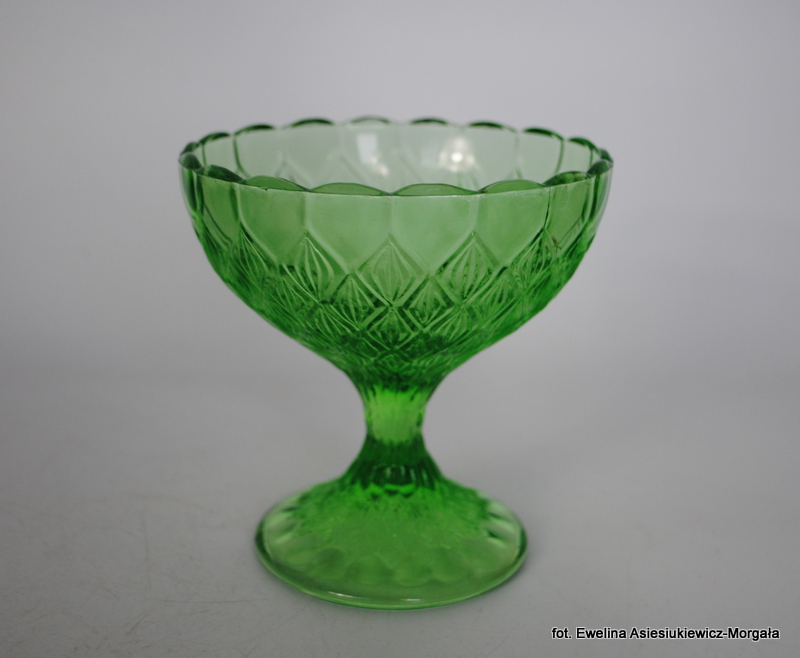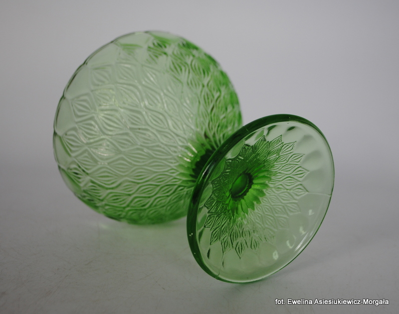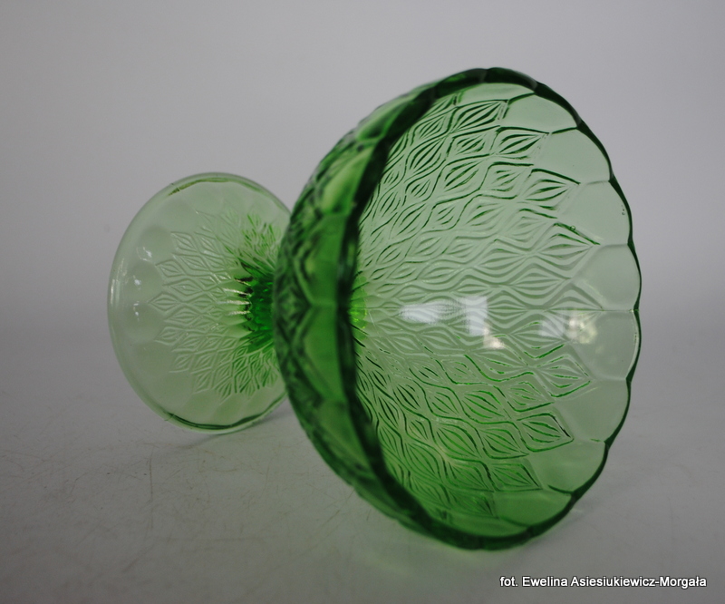 Cukiernica, HSG Ząbkowice. Szkło prasowane, barwione w masie na kolor zieleni uranowej.
