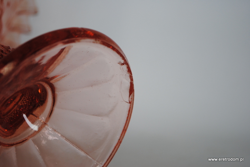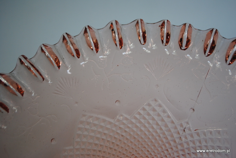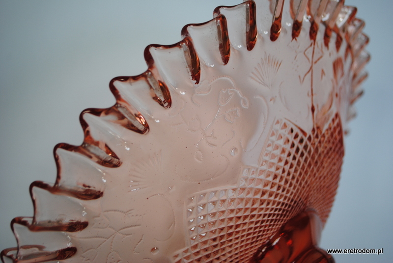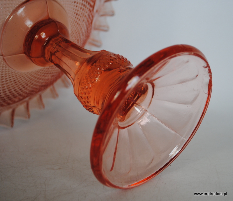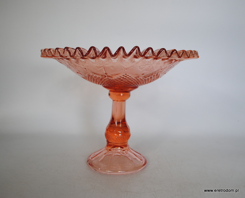 Owocarka z falbanką, HSG Ząbkowice, nr 2203. Szkło prasowane, barwione w masie na łososiowy kolor.