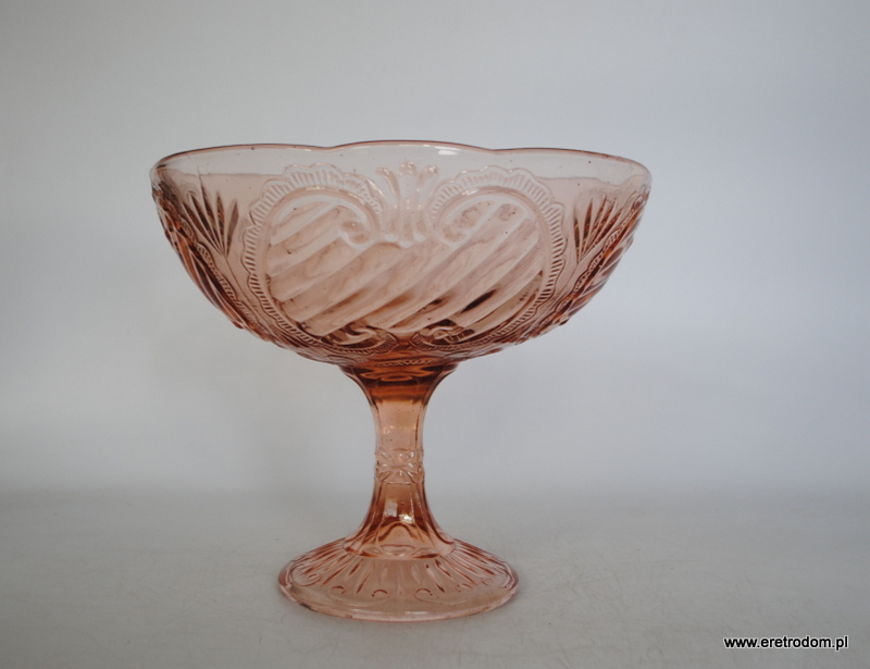 Owocarka, produkcja HSG Ząbkowice, nr 1037. Szkło prasowane, barwione w masie na łososiowy kolor.