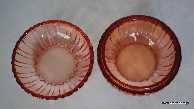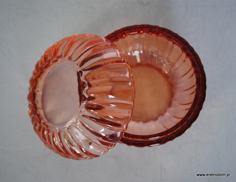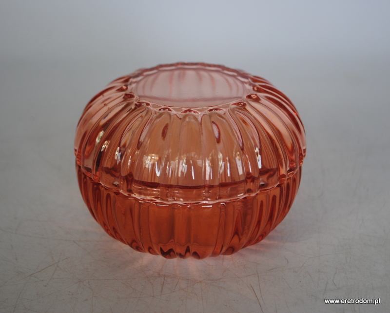 Puzderko/bomboniera, HSG Ząbkowice, nr katalogowy 1621. Szkło prasowane, barwione w masie na łososiowy kolor.