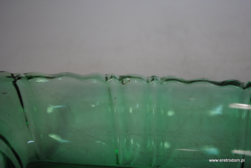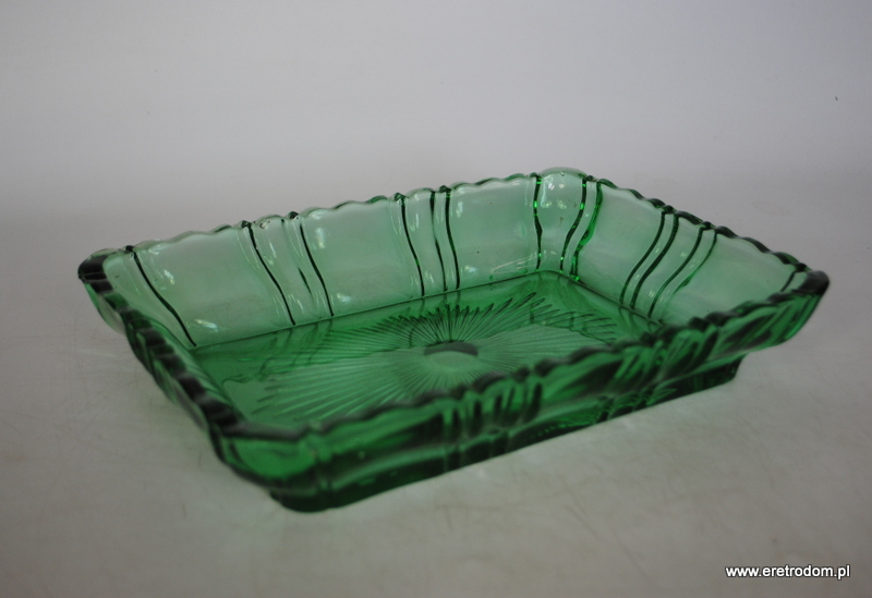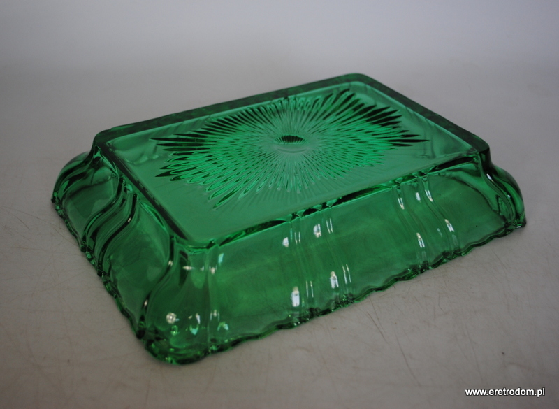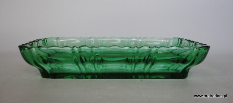 Taca wyprodukowana w HSG Ząbkowice (numer 1215). Szkło prasowane, barwione w masie.