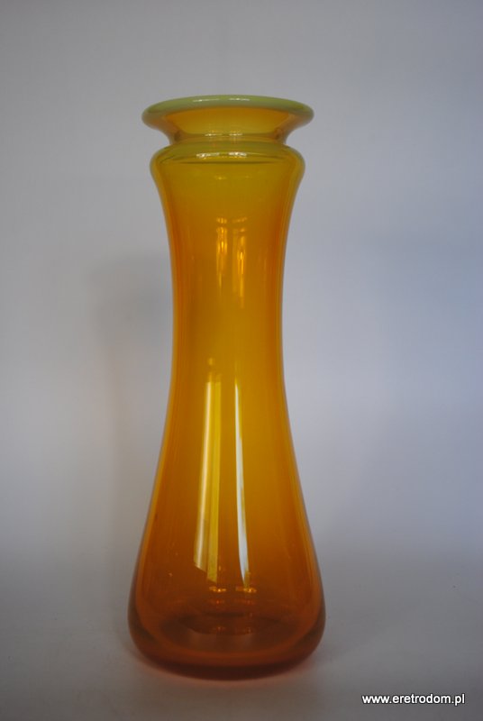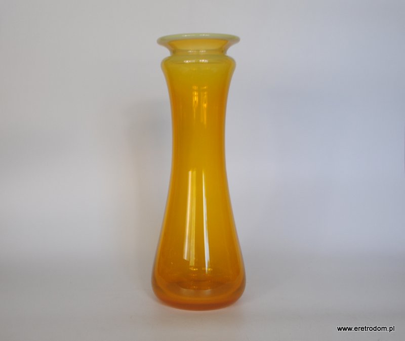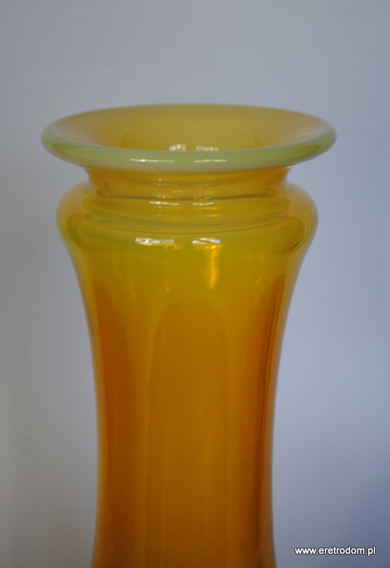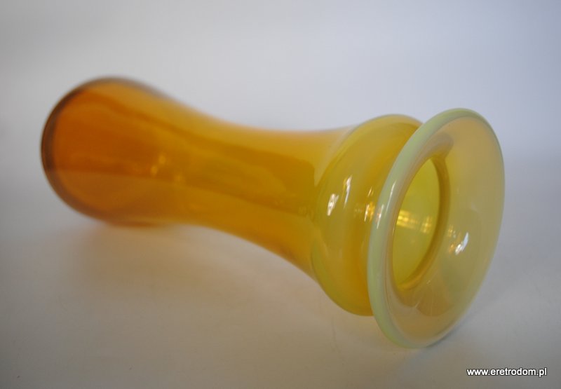 Wazon Secco, proj. Ludwik Fiedorowicz dla HSG Ząbkowice. Szkło barwione w masie na ciekawy żółty kolor. Dół w ciemniejszym odcieniu. Rant mleczny,