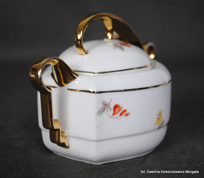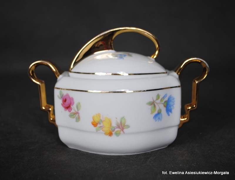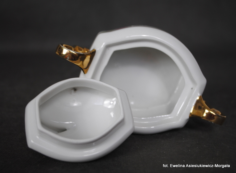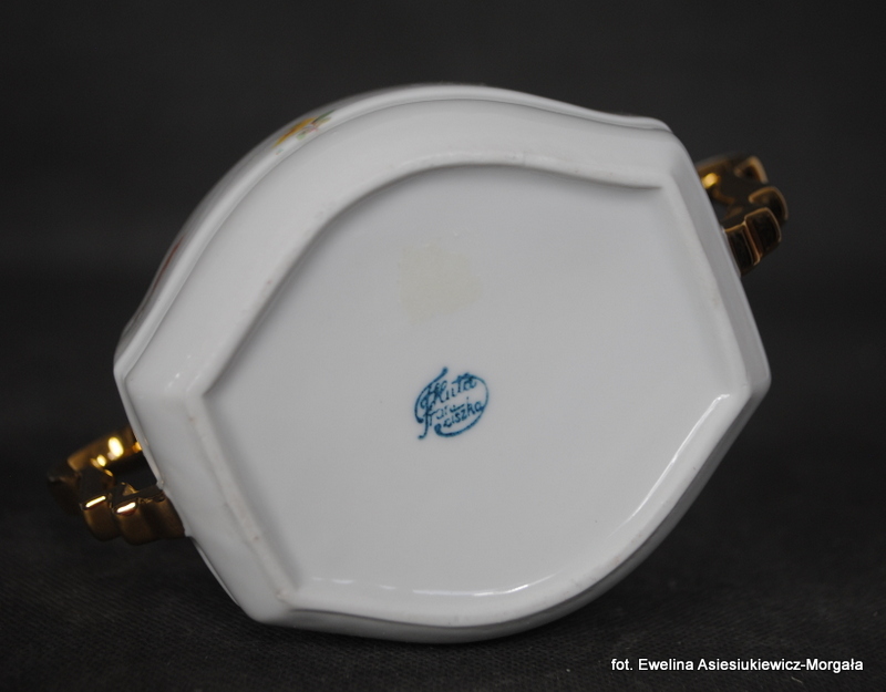 Cukiernica sygnowana Huta Franciszka (I poł. XXw.). Biała porcelana ozdobiona kalką kwiatową, uszy złocone.