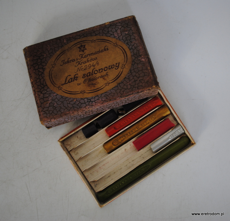 Zestaw laków. Iskra i Karmańaki, I poł. XXw. w zestawie 6 kolorów laku. Całość w oryginalnym opakowaniu.