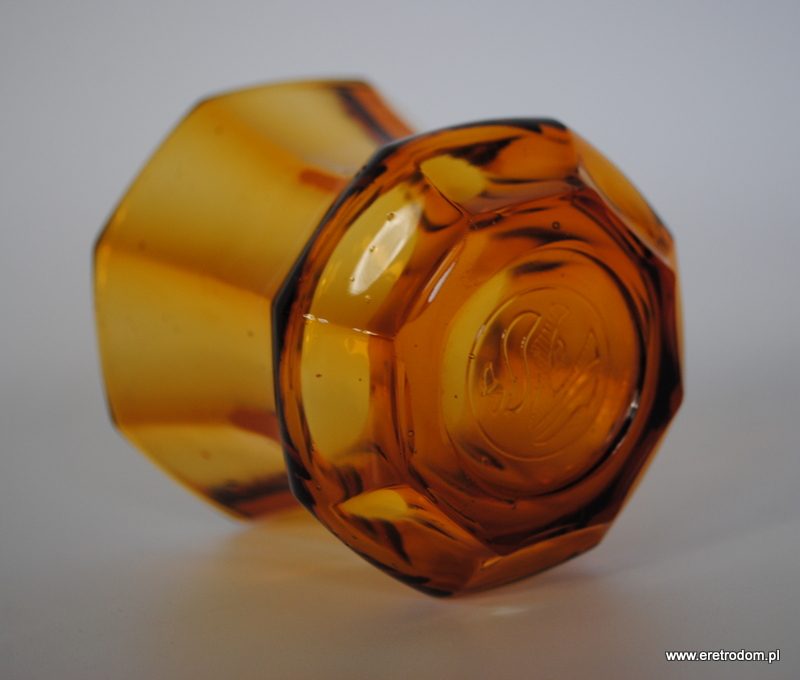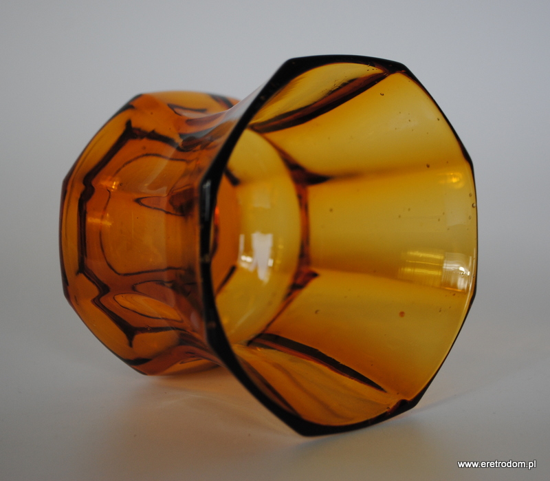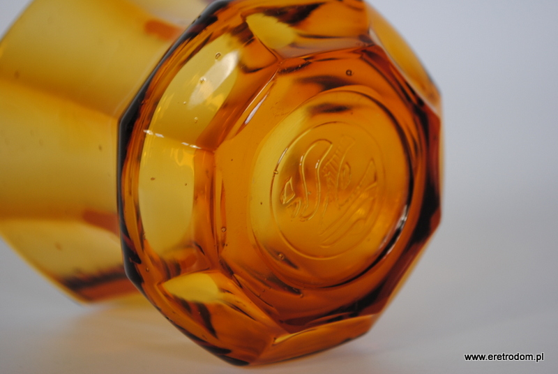 Wazon wyprodukowany w Hucie J. Stolle Niemen. Numer katalogowy to 935. Szkło sodowe barwione w masie na intensywny pomarańczowy kolor. Od spodu sygnowany.