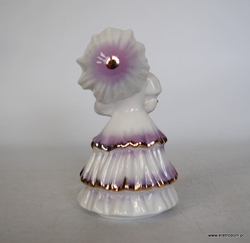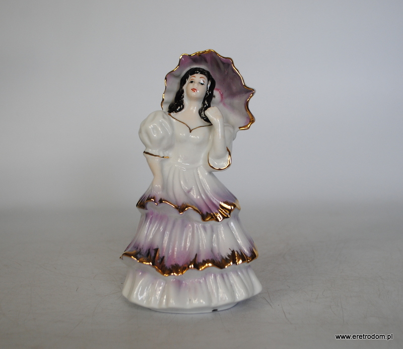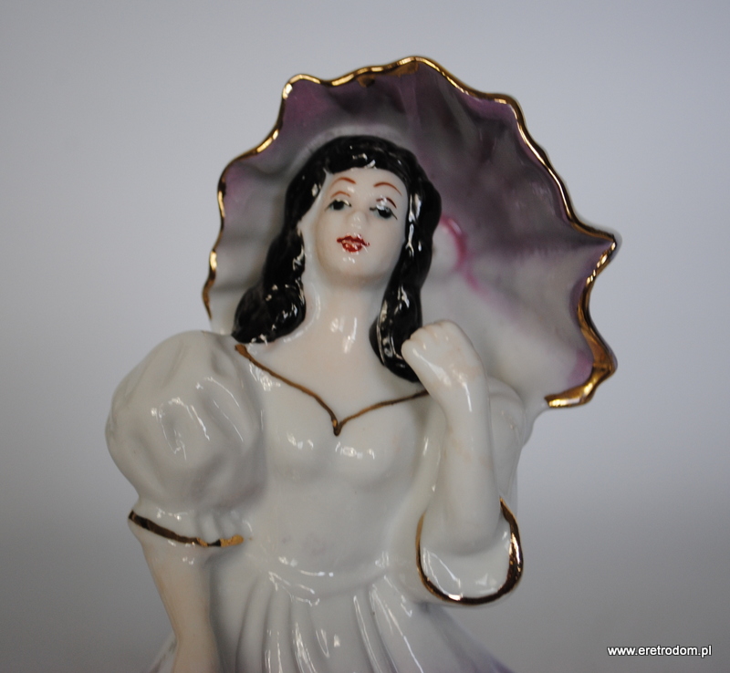 Figurka przedstawiająca panienkę z parasolką. Biała porcelana ręcznie malowana.