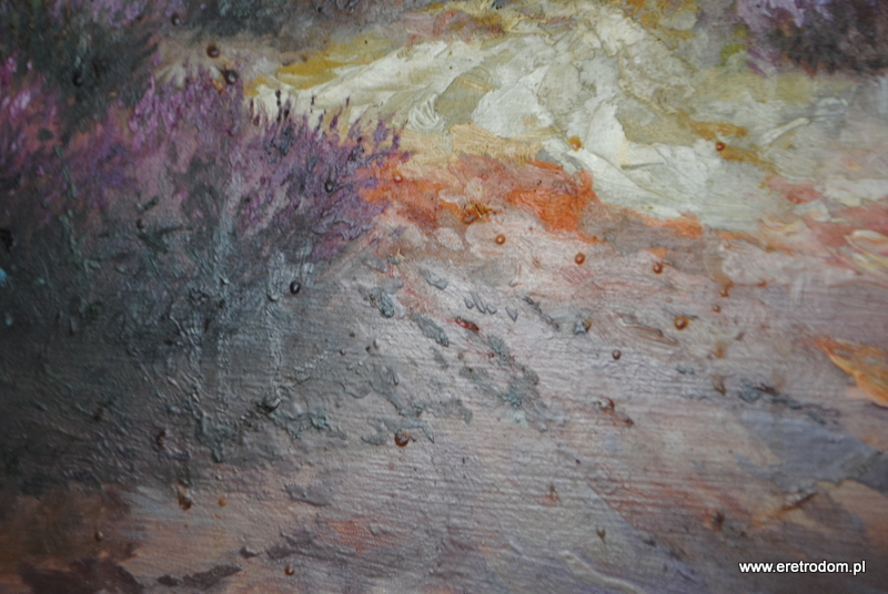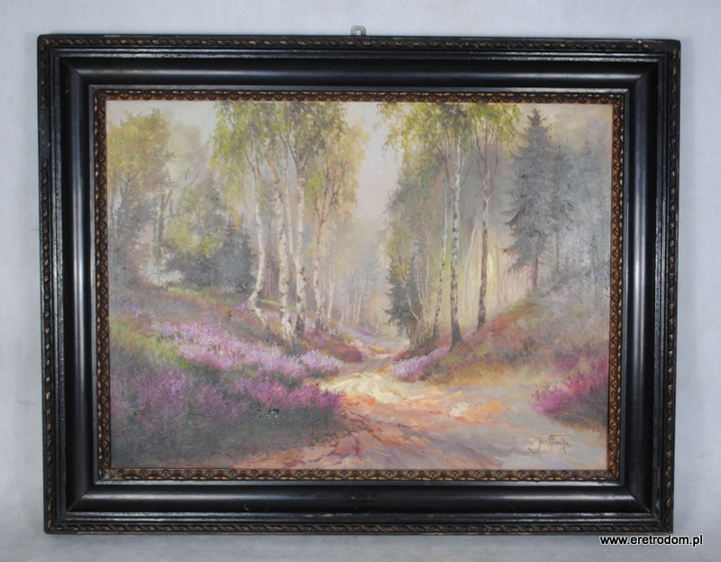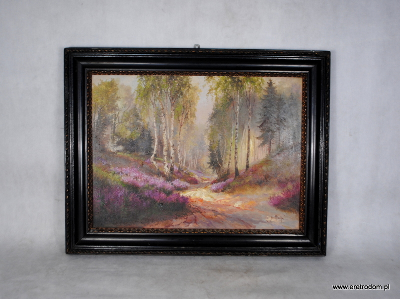 Józef Franke, obraz Wrzosowisko, olej na dykcie, II poł XXw. Całość w drewnianej ramie.